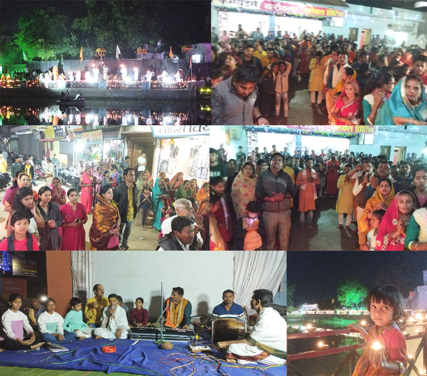 धमधा। बजरंग चौक हनुमान मंदिर में कार्तिक पूर्णिमा के अवसर पर दीपदान उत्सव धूमधाम से मनाया गया। इसमें 10 हजार दीयों से हनुमान बावली को सजाया गया, जिससे चारों ओर सुनहरी रोशन जगमगा उठी। दिव्य गंगा आरती भी की गई, जिसमें नौ यजमानों ने पारंपरिक नृत्य शैली में आरती की। हनुमत भक्त मंडली व्दारा आयोजित इस कार्यक्रम में पूरे नगरवासियों का सहयोग रहा। पहले हनुमान मंदिर और बजरंग चौक की दीयों से सजाया गया। मंच पर डीपी शर्मा, संजय तिवारी सहित गायक व वादकों ने सुंदरकांड पाठ, हनुमान अष्टक, श्रीरामस्तुति की प्रस्तुति दी। ढोलक, मंजीरे और झांझ की धुन पर वातावरण भक्तिमय हो गया। इसके पश्चात् दक्षिणमुखी हनुमान की पूजा-अर्चना की गई। आरती थाल सजाकर पुजारी अंकित शर्मा एवं ज्ञानेश्वर ताम्रकार ने थिरकते हुए नृत्य शैली में आरती की। आरती कीजै हनुमान लला की की धुन पर श्रद्धालु थिरकने लगे। महिलाओं ने अपने घर से सजाकर लाए दीपक थाल से आरती की। इसके पश्चात् हनुमान बावली में 10 हजार दीयों को जलाया गया। इसमें श्री त्रिमूर्ति महामाया सेवा समिति, श्री शीतला मंदिर समिति, धर्मधाम गौरवगाथा समिति, हिन्द एथलेटिक्स क्लब व ढीमरपारा दुर्गोत्सव समिति सहित नगरवासियों ने बढ़-चढ़कर हिस्सा लिया। एक साथ दीये जलने से तालाब का पार सुनहरी रोशन से नहा उठा। दीयों की रोशन का प्रतिबिंब पानी पर पड़ने से सुंदर छटा उभरी। मुख्य अतिथि सपाद लक्षेश्वर धाम के ब्रम्हचारी ज्योतिर्मयानंद ने मंत्रोचार करके भव्य गंगा आरती की शुरुआत की। नौ यजमान यजमान घनश्याम शर्मा, उमाकांत शर्मा, अतुल दुबे, अंकित शर्मा, रवि शर्मा, आशुतोष शर्मा, प्रियांशु शर्मा, रामकृष्ण शर्मा, विनय तिवारी, हरीश शर्मा व अखिलेश शर्मा ने नृत्य शैली में धूप आरती व ज्योति आरती की प्रस्तुति दी। जै गंगा मइया की धुन पर धर्मेंद्र ताम्रकार ने केशियो के साथ गायन किया, जिसमें श्रद्धालू झूम उठे। इस आयोजन में मुख्य रूप से गिरधर पटेल, रामदेव शर्मा, गोविन्द पटेल, सुजीत ताम्रकार, अजय शर्मा, सामर्थ्य ताम्रकार, सुनील सिन्हा, अनिल यादव, उमेश सोनी, समय लाल धीवर ने विशेष भूमिका निभाई। श्रद्धालुओं ने इस आयोजन की सराहना की और कहा कि इस तरह की आरती हमने हरिव्दार में देखी थी, हनुमान बाउली में उसकी झलक देखने को मिली। इस आयोजन में पवन कोचर, कौशल ताम्रकार, अवध ताम्रकार, बाबूराम चंदेल, सोनपाल यादव, मनोज कसार, डोमार वर्मा, सोमेश्वर, रोहित यादव, लोकपाल ताम्रकार, विकास अग्रवाल, कल्याण सिंह चौहान, दीपक सोनी, गिरजा कश्यप, विपुल महोबिया, भूषण ढीमर, दिनेश लोधी, धर्मेंद्र यादव का विशेष योगदान रहा। प्रसाद की व्यवस्था भूपेंद्र पटेल, संतोष पटेल, बीकानेर स्वीट्स एवं बबला गुप्ता व्दारा की गई।