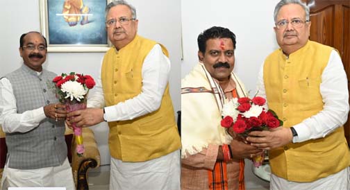 उपमुख्यमंत्री अरुण साव और विजय शर्मा ने भी की मुलाकातरायपुर ।गत संध्या को छत्तीसगढ़ सरकार में नवनिर्वाचित मुख्यमंत्री विष्णु देव साय और उप मुख्यमंत्री अरुण साव व विजय शर्मा ने भूतपूर्व मुख्यमंत्री डॉ रमन सिंह के निवास स्थान पहुंचकर उनसे मुलाकात की।इस दौरान डॉ रमन सिंह ने मुख्यमंत्री साय और उपमुख्यमंत्री अरुण साव व विजय शर्मा को नव दायित्व के लिए शुभकामनाएं व्यक्त करते हुए डेढ़ दशक के भाजपा के शासनकाल के अनुभव साझा किया इसके साथ ही विभिन्न विषयों पर चर्चा की।