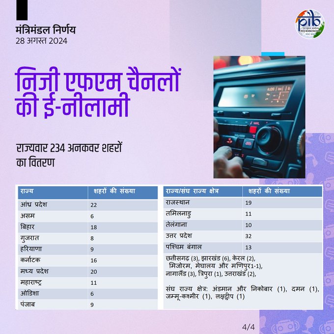 नयी दिल्ली। केंद्रीय मंत्रिमंडल ने बुधवार को निजी एफएम रेडियो चरण-3 नीति के तहत 234 नए शहरों में 730 चैनलों के लिए आरोही ई-नीलामी के तीसरे समूह के प्रस्ताव को मंजूरी दे दी। इसके लिये अनुमानित आरक्षित मूल्य 784.87 करोड़ रुपये आंका गया है। छत्तीसगढ़ में जगदलपुर, अंबिकापुर और कोरबा में 3 FM radio केंद्र को मंजूरी मिली है।