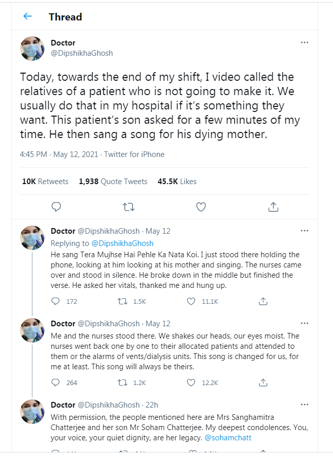 - कोलकाता। कोलकाता में कोरोना वायरस से पीडि़त एक मां की अंतिम समय में बेटे के साथ हुई वीडियो कॉल ने हर किसी को भावुक कर दिया है। ड्यूटी पर तैनात एक महिला डॉक्टर ने ट्वीटर पर यह वाकया पोस्ट किया है जिसे पढऩे के बाद हर कोई भावुक हो गया है। देखते ही देखते हजारों लोगों ने इस पोस्ट को शेयर किया है और अपनी प्रतिक्रिया दी है।यह पोस्ट एक बेटे के बारे में था, जिसकी मां अस्पताल में काफी गंभीर अवस्था में थी। डॉक्टरों ने उनके बचने की उम्मीद खो दी थी। बेटे को भी पता था कि मां नहीं बच पाएंगी। अपोलो ग्लेनीगल्स की क्रिटिकल केयर की डॉक्टर दीपशिखा घोष ने बताया कि वे इस कोरोना महामारी के दौरान अस्पताल में भर्ती मरीजों को उनके अपनों से जोडऩे के लिए वीडियो कॉल पर बात कराती हैं। अपनों से दूर अस्पताल में अकेले कोरोना के खिलाफ जंग लड़ रहे लोगों को जब वीडियो कॉल पर अपने लोग नजर आते हैं तो वे बहुत खुश होते हैं। बुधवार को भी उन्होंने ऐसी ही एक वीडियो कॉल की, लेकिन उन्हें उम्मीद नहीं थी कि यह वीडियो कॉल उनके लिए बहुत भावुक होने वाली है। आईसीयू में जो हुआ उसके लिए वह बिल्कुल तैयार नहीं थीं।डॉ. दीपशिखा ने बताया कि 47 वर्षीय महिला संघमित्रा चटर्जी ने अपने 25 वर्षीय बेटे सोहम चटर्जी के साथ वीडियो कॉल की। बेटे ने अपनी मां का हालचाल पूछा और मुझसे मेरे कुछ मिनट मांगे। उसके बाद बेटे ने 1973 की 'आ गले लग जा' फिल्म का किशोर कुमार का गाना गाया तो हर किसी की आंखों में आंसू आ गए। यह गाना था, 'तेरा मुझसे है पहले का नाता कोई...।'डॉक्टर ने ट्वीटर पर अपनी पोस्ट में लिखा, 'आज, मेरी शिफ्ट खत्म होने से बाद एक मां ने अपने बच्चे के बात करने की इच्छा जाहिर की। मैंने वीडियो कॉल पर दोनों को जोड़ा। मैं अपने हाथ में मोबाइल लेकर खड़ी थी। बेटा गाना गा रहा था... तेरा मुझसे है पहले का नाता कोई...यू हीं नहीं दिल लुभाता कोई...। मैं इस दौरान बेटे और मां दोनों के चेहरे के भाव बारी-बारी से देख रही थी। नर्से पास आकर चुपचाप खड़ी हो गईं। वह गाते हुए बीच में रो भी पड़ा, पर उसने गीत पूरा किया। उसने मुझे मां के बारे में पूछा। थैंक्स कहा और फिर कॉल काट दी। फिर अचानक उन्होंने अंतिम सांस ली।'डॉ. ने आगे लिखा- मैं और नर्स वहीं खड़े रहे। हमने अपना सिर हिलाया, हमारी आंखें नम हो गई थीं। इसके बाद नर्से एक-एक कर अपने मरीजों के पास चली गईं. इस गीत ने हम सभी को हमेशा के लिए बदल दिया, मेरे लिए यह गीत हमेशा उनका रहेगा।