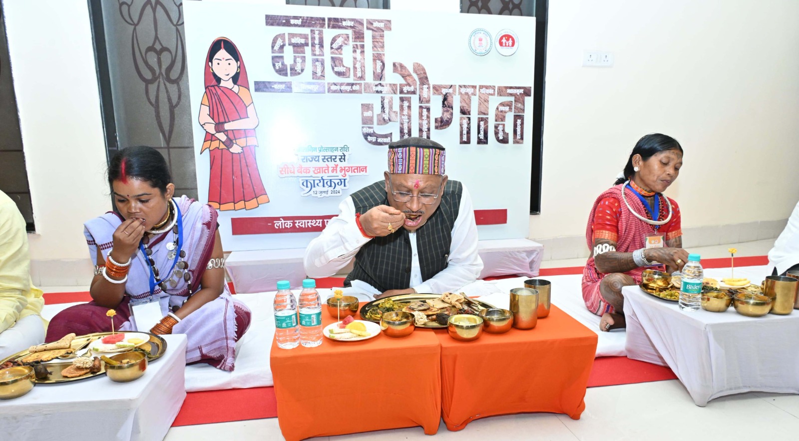 रायपुर / राजधानी रायपुर में मितानिन दीदियों को प्रोत्साहन राशि वितरण के लिए आयोजित ‘नवा सौगात‘ कार्यक्रम के बाद मुख्यमंत्री श्री विष्णु देव साय ने मितानिन बहनों के साथ दोपहर का भोजन किया।मुख्यमंत्री श्री साय पंगत में बस्तर दरभा से आयी मितानिन दीदियों जयमनी नाग और कवर्धा की बैगा जनजाति की दसनी बाई के साथ भोजन करने बैठे। भोजन में दही मिर्ची, लाई बड़ी, बिजौरी, चावल पापड़, चना, लाल भाजी, जिमीकांदा, मुनगा की सब्जी, इडहर कड़ी, भरवा करेला, चावल, कोदो चावल, रोटी, मीठे में रागी लड्डू, अंदरसा, गुलगुला, पीड़िया, मठ्ठा आदि परोसा गया। भोजन के प्रारंभ में फ्रूट सलाद भी सर्व किया गया।