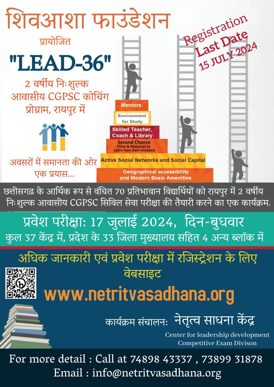 रायपुर / नेतृत्व साधना केंद्र, “LEAD-36” कार्यक्रम के लिए प्रवेश परीक्षा 17 जुलाई को आयोजित कर रहा है। जहाँ प्रदेश के 70 ऐसे प्रतिभावान युवाओं को जो आर्थिक, सामाजिक रूप से पिछड़े हैं उनको 2 वर्षीय CGPSC सिविल सेवा की निःशुल्क आवासीय कोचिंग उपलब्ध रहेगा। उल्लेखनीय है कि साधना केंद्र 2 वर्षीय कार्यक्रम के बेहतर स्वरूप में, सफलता के अवसरों में समानता के लिए दृढ़ता से प्रतिबद्ध है। नेतृत्व साधना केंद्र विगत तीन वर्षों से 2 वर्षीय CGPSC, सिविल सेवा परीक्षा की निःशुल्क आवासीय कोचिंग उपलब्ध करा रहा है जहाँ प्रदेश के अनेक प्रतिभावान युवा प्रशिक्षण ले रहें हैं। इसी कड़ी में संस्था अपनी चतुर्थ वर्ष में प्रवेश करते हुए पुनः युवाओं का चयन करने जा रहा है।