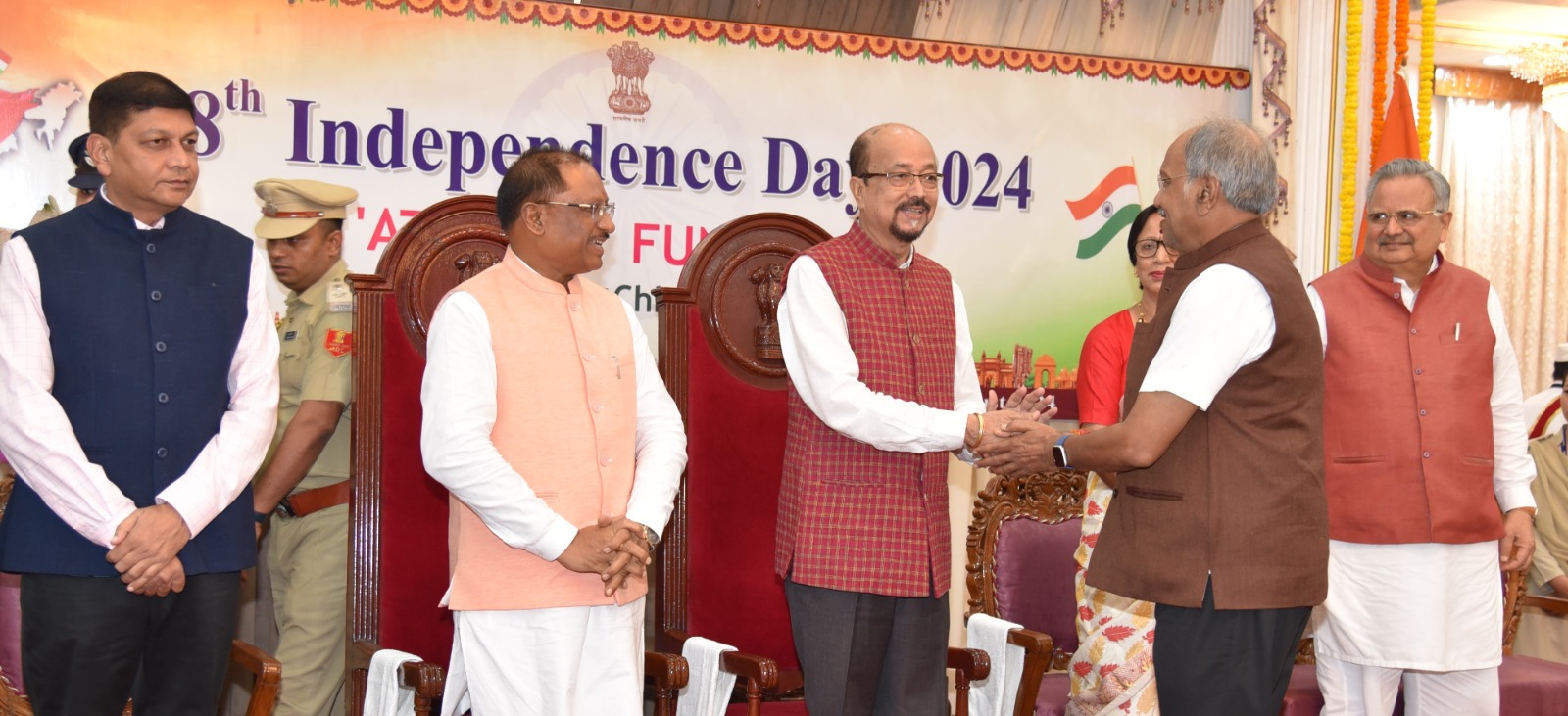 रायपुर /स्वतंत्रता दिवस के अवसर पर आज शाम यहां राजभवन में स्वागत समारोह का आयोजन किया गया, जिसमें प्रदेश के विभिन्न क्षेत्रों की हस्तियां शामिल हुईं। राज्यपाल श्री रमेन डेका ने सभी को स्वतंत्रता दिवस की शुभकामनाएं दी। राज्यपाल श्री डेका को मुख्यमंत्री श्री विष्णु देव साय ने पुष्पगुच्छ भेंट कर स्वतंत्रता दिवस की हार्दिक बधाई और शुभकामनाएं दी। इस अवसर पर प्रथम महिला श्रीमती रानी डेका काकोटी उपस्थित थीं।