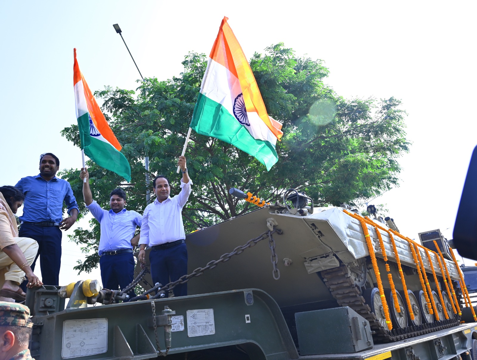 रायपुर. भव्य सैन्य समारोह के लिए आज रायपुर पहुंचे भारतीय सेना के भीष्म टैंक और अन्य आर्टिलरी का कलेक्टर डॉ. गौरव सिंह तथा ज़िला प्रशासन ने किया स्वागत।