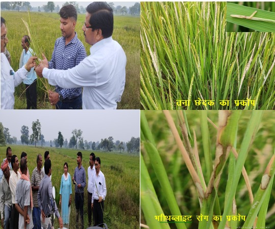 बिलासपुर/ जिले के विभिन्न ग्रामों में धान की फसल गभोट से लेकर दूधिया अवस्था में है। कुछ शीघ्र पकने वाली किस्में परिपक्वन अवस्था में है। इस अवस्था में दिन का तापमान ज्यादा होने एवं रात का तापमान तुलनात्मक रूप से कम होने तथा सतत् वर्षा होने के कारण कीड़े एवं बिमारियों के लिए अनुकूल परिस्थिति है। किसानों के खेतों में फसल की निगरानी हेतु दिनांक 07.10.2024 को कृषि विज्ञान केन्द्र एवं उपसंचालक कृषि बिलासपुर के संयुक्त निरीक्षण दल ने मस्तूरी विकासखण्ड के ग्राम जयरामनगर-खैरा में किसानों के खेतों में भ्रमण कर कीट-व्याधि प्रकोप का निरीक्षण किया। निरीक्षण के दौरान लगभग 100 एकड़ में लगी धान की किस्म सम्पदा एवं राधे स्वर्णा में तना छेदक कीट का अत्यधिक प्रकोप पाया गया। अनुमानतः 25-30% तक क्षति होने की आशंका है। इस वर्ष तनाछेदक कीट का प्रकोप बढ़ने का मुख्य कारण कीट के अनुकूल जलवायु, दवाओं के प्रयोग के उपरांत वर्षा हो जाने से दवाओं का असर न होना तथा कीट में दवाओं के प्रति प्रतिरोधिता का विकसित होना है। चंूकि धान की फसल अब मिल्किंग तथा परिपक्वन अवस्था में है, विभिन्न दवाओं का प्रयोग करने के कारण अब अनुशंसित दवाएं क्लोरानट्रेनिलिप्रोल 18.5% SC60 मि.ली. प्रति एकड़ या कार्टाफ हाइड्रोक्लोराइड 50% SP 400 ग्राम प्रति एकड़ कारगर नहीं होंगी एवं काफी नुकसान की आशंका है।