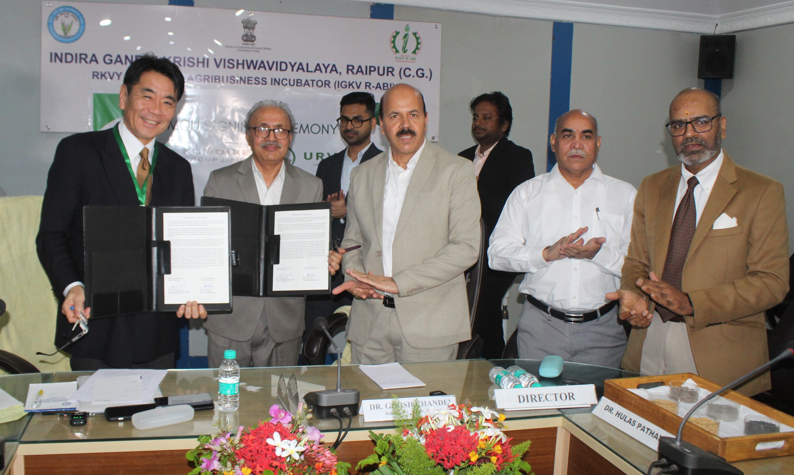 रायपुर। इंदिरा गांधी कृषि विश्वविद्यालय, रायपुर में संचालित एग्री बिजनेस इन्क्यूबेशन सेन्टर, (राबी) के स्टार्टअप ‘‘उर्वरक इंडस्ट्रीज प्राइवेट लिमिटेड’’ एवं ‘‘कोनोइके ग्रुप, जापान’’ के बीच आज यहां एक एम.ओ.यू. हस्ताक्षर समारोह का आयोजन किया गया। इंदिरा गांधी कृषि विश्वविद्यालय के कुलपति डॉ. गिरीश चंदेल की उपस्थिति में उर्वरक इंडस्ट्रीज प्राइवेट लिमिटेड के संस्थापक अनिल पासरी एवं कोनोइके ग्रुप के महाप्रबंधक कात्सुफुमि ओत्सुकी ने एम.ओ.यू. में हस्ताक्षर किये। इस अवसर पर कोनोइके ग्रुप सीनियर बिजनेस डेवलपमेंट मैनेजर हीरोशी सोएजिमा, कार्यकारी अधिकारी तोशिहिरो फुजिवारा और उनकी टीम सहित इंदिरा गांधी कृषि विश्वविद्यालय के संचालक एवं निदेशकगण तथा कृषि महाविद्यालय, रायपुर के अधिष्ठाता एवं एग्री बिजनेस इन्क्यूबेशन सेन्टर के मुख्य कार्यपालन अधिकारी डॉ. हुलास पाठक एवं उद्योगपति उपस्थित थे।