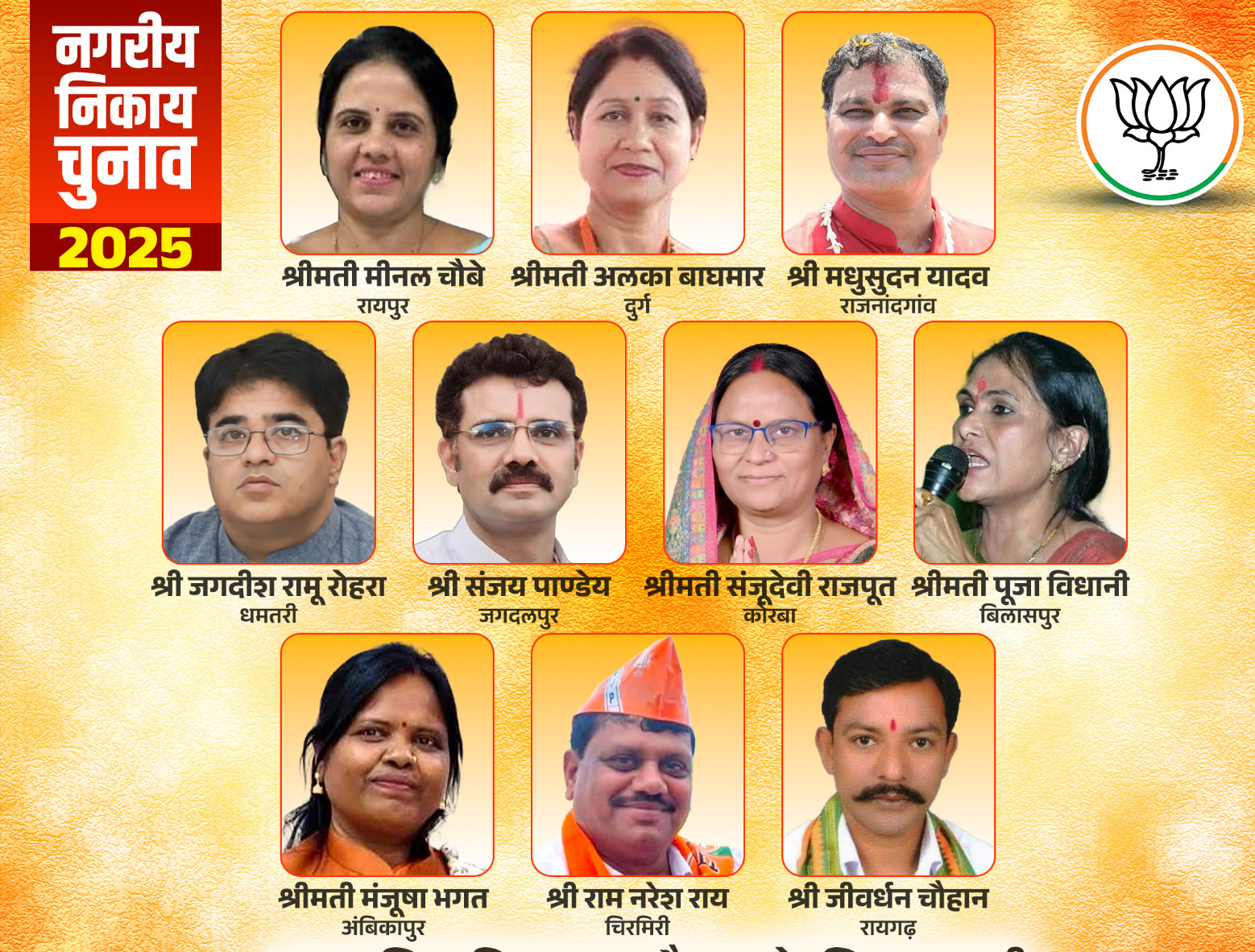 रायपुर। भारतीय जनता पार्टी ने प्रदेश के दस नगर निगमों के लिए महापौर प्रत्याशियों का ऐलान कर दिया है। इनमें पांच महिला प्रत्याशी भी शामिल हैं। रायपुर से भाजपा ने निगम की नेता प्रतिपक्ष मीनल चौबे को अपना प्रत्याशी बनाया गया है। वहीं, दुर्ग में अलका बाघमार, बिलासपुर में पूजा विधानी, राजनांदगांव से मधुसूदन यादव, अंबिकापुर से मंजूषा भगत, जगदलपुर से संजय पांडेय, धमतरी से जगदीश रामू रोहरा, रायगढ़ से जीवर्धन चौहान, कोरबा से संजू देवी राजपूत और चिरमिरी से रामनरेश राय को भाजपा ने अपना प्रत्याशी बनाया है।
