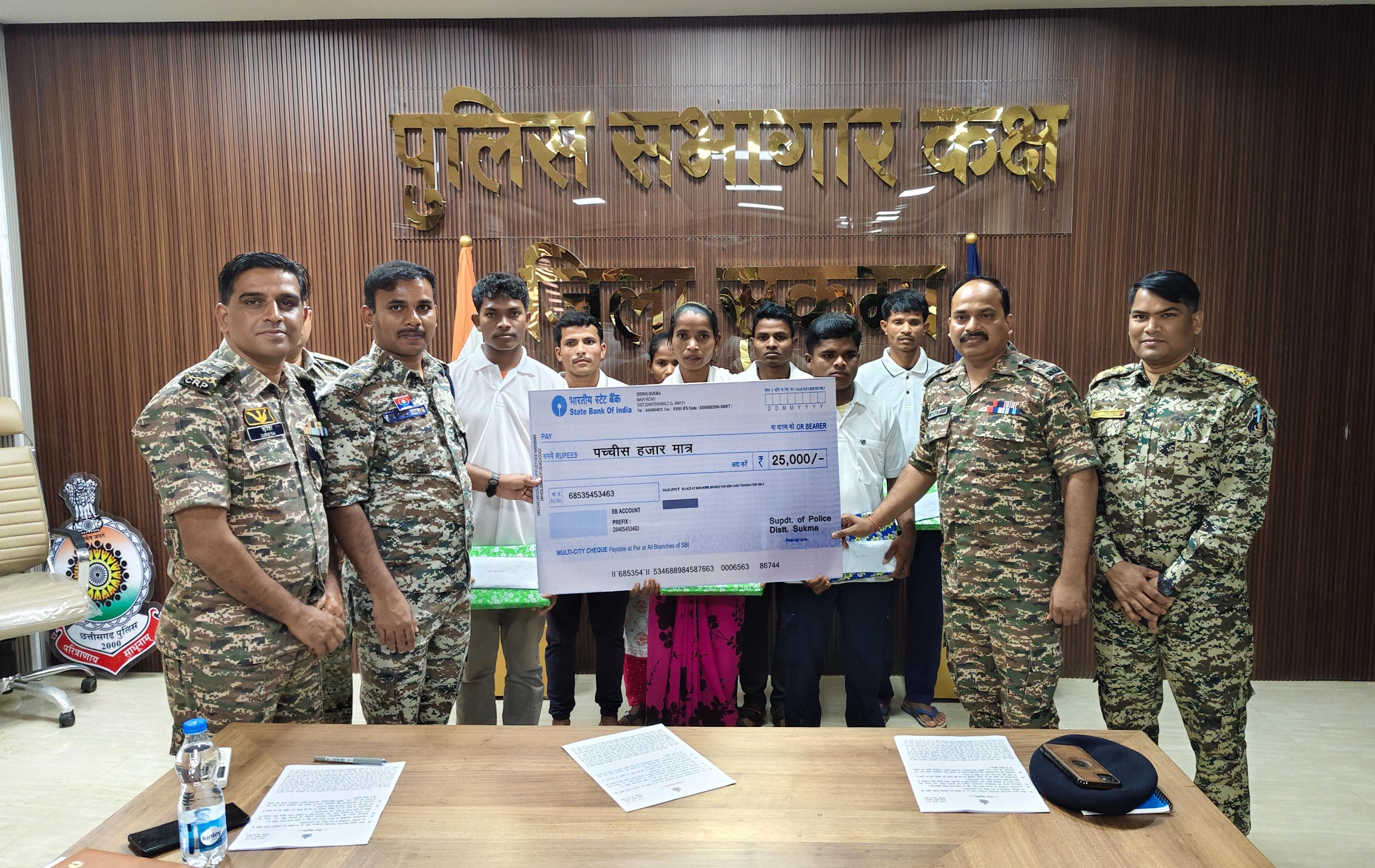 ???? उपरोक्त सभी आत्मसमर्पित नक्सलियों को ‘‘छत्तीसगढ़ नक्सलवाद उन्मूलन एवं पुनर्वास नीति’’ के तहत् सहायता राशि 25-25 हजार रू0 के मान से प्रत्येक को प्रोत्साहन राशि व कपड़े प्रदान किया गया एवं अन्य सुविधायें प्रदान करोये जायेंगे।