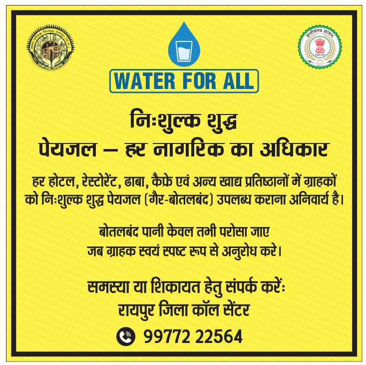 रायपुर - छत्तीसगढ शासन के नगरीय प्रशासन एवं विकास विभाग के निर्देशानुसा रायपुर जिला प्रशासन के दिशा निर्देशन में राजधानी शहर रायपुर नगर निगम क्षेत्र में नगर निगम मुख्यालय नगर निवेश उडनदस्ता और सभी जोनो के नगर निवेश विभागो की टीमो द्वारा निगम क्षेत्र में वॉटर फॉर ऑल निशुल्क शुद्ध पेयजल हर नागरिक का अधिकार अभियान प्रारम कर दिया गया है। इसके तहत हर होटल, रेस्टोरेट, ढाबा, कैफे एवं अन्य खाद्य प्रतिष्ठानो में ग्राहको को गैर बोतलबंद निःशुल्क शुद्ध पेयजल उपलब्ध कराना अनिवार्य है। बोतल बंद पानी केवल तभी परोसा जाए जब ग्राहक स्वयं स्पष्ट रूप से अनुरोध करें।