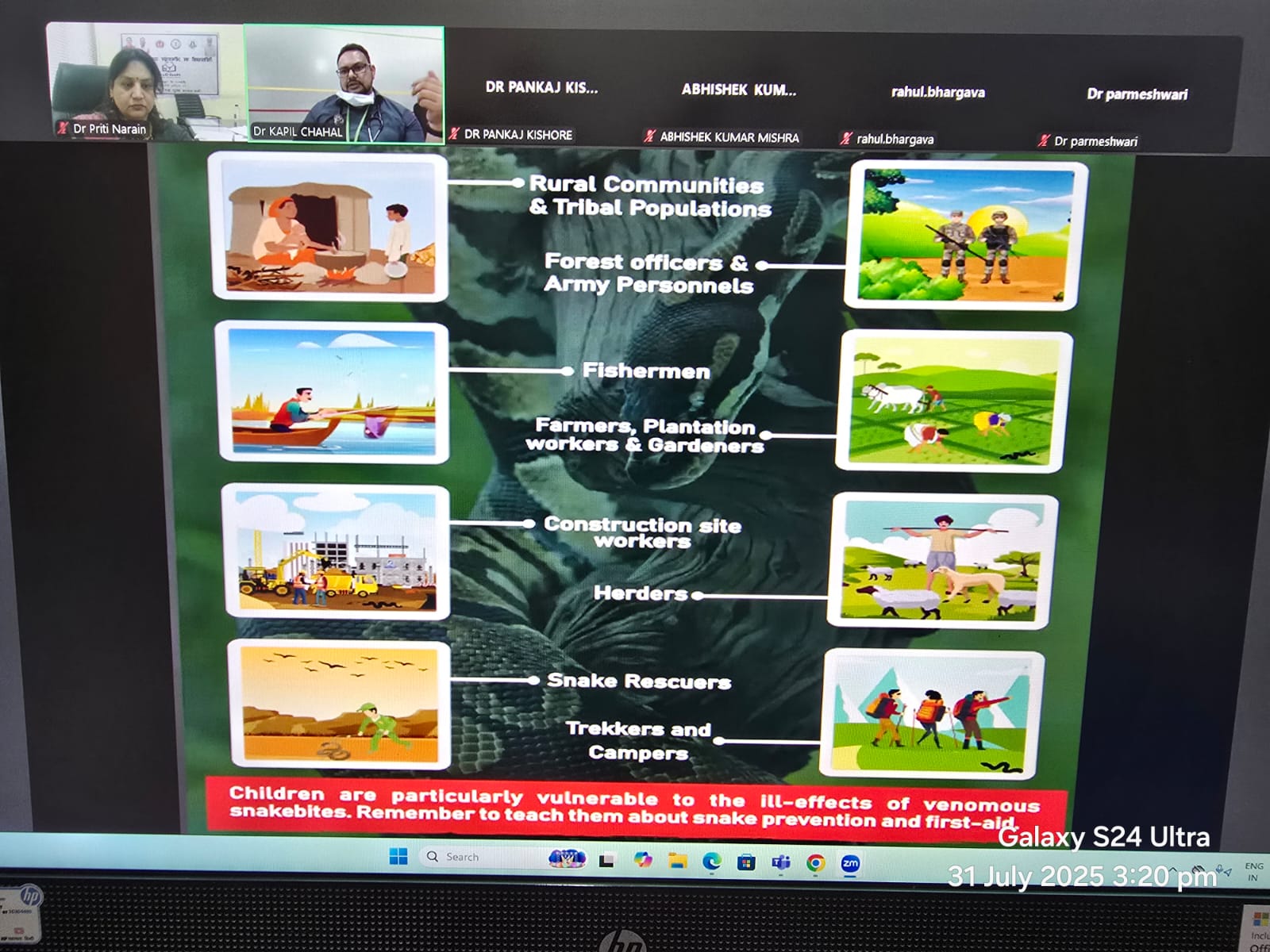 रायपुर l जिलाधीश डॉक्टर गौरव कुमार सिंह के निर्देशानुसार तथा मुख्य चिकित्सा एवं स्वास्थ्य अधिकारी डॉक्टर मिथिलेश चौधरी के मार्गदर्शन में प्रत्येक गुरुवार ज़िले में शासकीय अस्पतालों में कार्यरत मेडिकल ऑफिसर का देश के अनुभवी विशेषज्ञों द्वारा विभिन्न चिकित्सा विषयों पर ऑनलाइन उन्मुखीकरण किया जा रहा है। इस शृंखला में आपातकालीन चिकित्सा सेवाओं के उन्नयन को ध्यान में रखकर आज सर्पदंश जैसी गंभीर स्तिथि में उचित चिकित्सकीय प्रबंधन evam जटिलताओं के नवीनतम निदान पर फोर्टिस हॉस्पिटल गुरुग्राम के अनुभवी विशेषज्ञ डॉक्टर कपिल चहल द्वारा प्रशिक्षण दिया गया। सर्पदंश से उत्पन्न लक्षण जैसे छिद्रीत घाव, दर्द, सूजन, लालिमा, उल्टी, साँस लेने में तकलीफ आम होती हैं। ऐसी स्तिथि में पीड़ित व्यक्ति के प्रभावी अंग को स्थिर कर, सूजन बढ़ने के पहले ही तंग कपड़े एवं आभूषण उतार दे तथा तुरंत ही निकटतम अस्पताल जाकर चिकित्सकीय उपचार करवाएं। अस्पताल में उचित विरोधी इलाज- एंटी वीनम प्रबंधन एवं अन्य चिकित्सकीय इलाज ही इसका एकमात्र प्रबंधन है। किसी भी तरह का घरेलु उपाय या झाड़ फूक में समय व्यर्थ करने के दुष्परिणाम जैसे गंभीर जटिलताएं, पक्षाघात एवं मृत्यु तक की सम्भावना होती है। सर्प दंश की घटनाओं को न्यूनतम करने में सामुदायिक भागीदारी, जागरूकता के साथ उचित चिकित्सकीय प्रबंधन अत्यंत आवश्यक है।लक्षणों के उपरांत त्वरित उपचार के दिशा में यह साप्ताहिक उन्मुखीकरण निश्चित ही मूल्यवान संसाधन है जिससे जिले में स्वास्थ्य सेवाओं की बेहतरी होगी l
