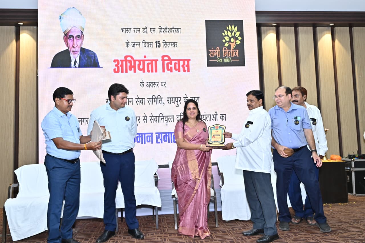 रायपुर. अभियंता दिवस भारत रत्न महान अभियंता मोक्षगुण्डम विश्वेश्वरैय्या की 165 वीं जयंती पर संगी मितान सेवा समिति नगर पालिक निगम रायपुर द्वारा नगर निगम रायपुर के सेवानिवृत्त वरिष्ठ अभियंताओं की सेवाओ का सम्मान किया गया। नगर निगम रायपुर मुख्यालय भवन महात्मा गांधी सदन के चतुर्थ तल सामान्य समा सभागार में आयोजित कार्यक्रम में नगर निगम रायपुर की महापौर श्रीमती मीनल चौबे एवं आयुक्त श्री विश्वदीप ने श्रीफल शॉल, स्मृति चिन्ह प्रदत्त कर नगर निगम रायपुर के सेवानिवृत्त वरिष्ठ अभियंता सर्वश्री राजेश शर्मा, हेमंत सोलंकी, सुभाष चंद्राकर, विनोद देवांगन, बी.एल. चंद्राकर, एस.पी त्रिपाठी, हरेन्द्र कुमार साहू, विनोद कुमार चतुर्वेदी, लोकेश चंद्रवंशी, सीबूलाल पटेल, आर.एन. पटेल, राकेश अवधिया, ललित वर्मा, के.के. शर्मा, विमल कुमार शर्मा सहित नगर पालिक निगम रायपुर के मुख्य अभियंता श्री यू. के. धलेन्द्र की सेवाओ को सम्मानित किया गया।