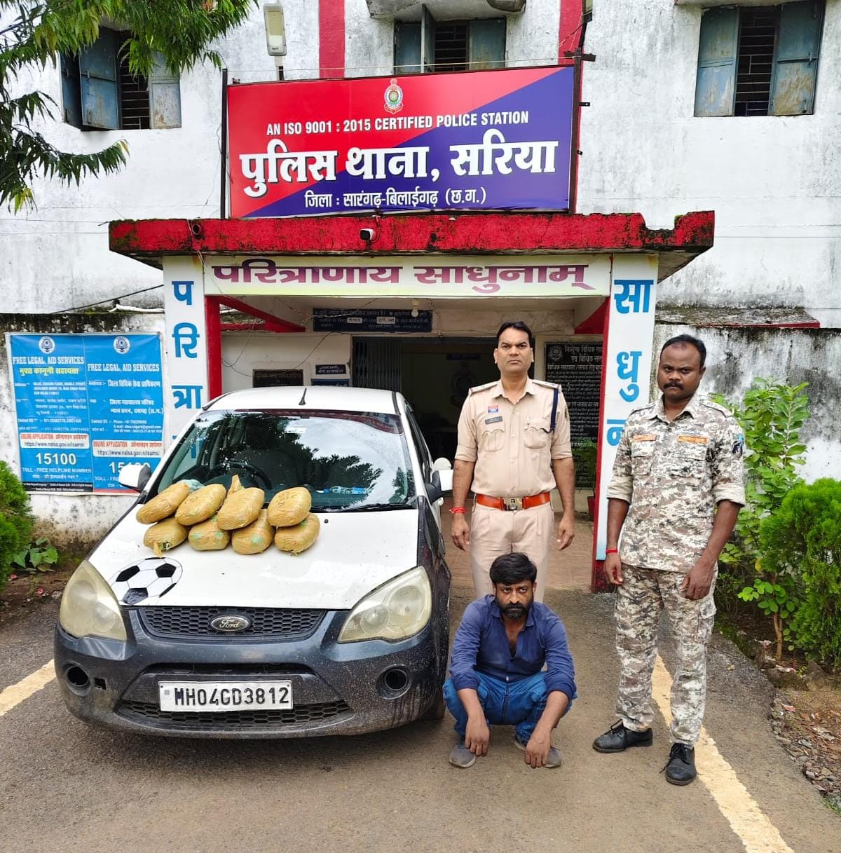 बिलाईगढ़। थाना सरिया पुलिस ने अवैध मादक पदार्थ तस्करी पर बड़ी कार्यवाही करते हुए 8 किलो 335 ग्राम गांजा के साथ एक आरोपी को गिरफ्तार किया है। आरोपी की पहचान गोविंद सिंह पिता हरिराम 38 वर्ष, निवासी गौरव नगर, देवास मध्य प्रदेश के रूप में हुई है।पुलिस ने आरोपी के कब्जे से 85 हजार क़ीमत की 8.335 किलो गांजा, एक फोर्ड कार MH 04 GD 3812, कीमत 2 लाख रूपये और एक मोबाइल क़ीमत 15 हजार जब्त किया। कुल जप्त संपत्ति की कीमत लगभग 3 लाख रूपये आंकी गई है। आरोपी के खिलाफ एनडीपीएस एक्ट की धारा 20(बी) के तहत मामला दर्ज कर न्यायिक रिमांड पर जेल भेजा गया है। कार्रवाई में सउनि सुमन चौहान, प्र.आर. सुरेंद्र सिदार, सत्यम मंडलोई, श्रवण टंडन सहित थाना स्टाफ का विशेष योगदान रहा।