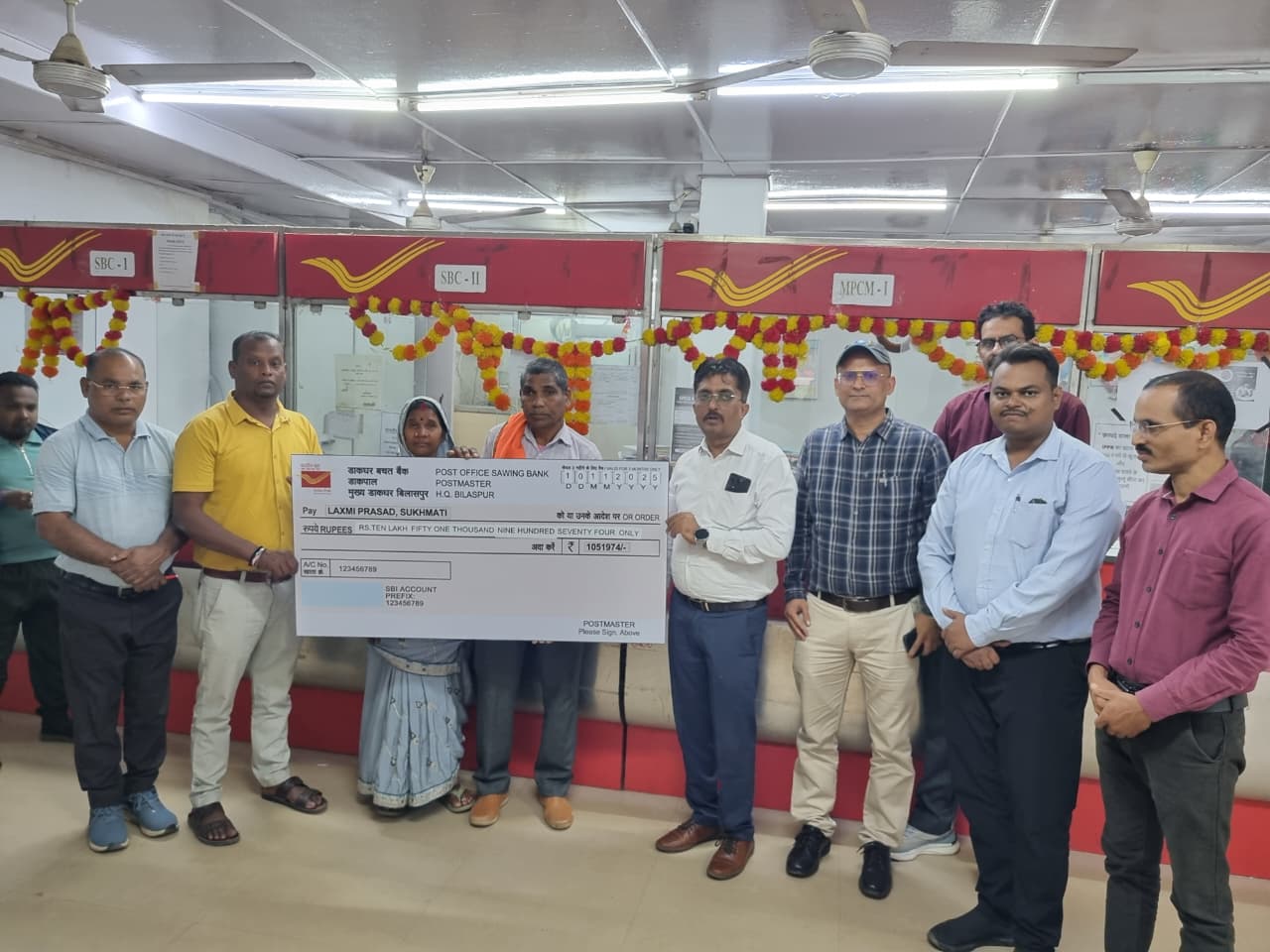बिलासपुर/ डाक विभाग की डाक जीवन बीमा योजना के अंतर्गत बीमाधारक श्री मुनेश्वर प्रसाद द्वारा प्रतिमाह 2456 रुपए का प्रीमियम 10 माह तक नियमित रूप से जमा किया गया था। दुर्भाग्यवश उनकी आकस्मिक मृत्यु होने पर, उनके नॉमिनी श्रीमती सुखमनी एवं श्री लक्ष्मी प्रसाद को विभाग द्वारा 10,51,974 रुपए (पूरे बीमाधन सहित बोनस) की राशि चेक के माध्यम से प्रधान डाकघर जांजगीर में प्रदान की गई। यह चेक अधीक्षक डाकघर बिलासपुर संभाग, श्री विनय कुमार प्रसाद द्वारा किया गया। इस अवसर पर सहायक अधीक्षक (दौरा), बिलासपुर श्री अरुण तिवारी, उपसंभागीय निरीक्षक जांजगीर उपसंभाग श्री निखिल गोपाल, पोस्टमास्टर जांजगीर श्री राजेश कुमार स्वर्णकार, धीरेंद्र राठौर, अमित कौशिक, जोगिंदर धृतलहरे एवं अन्य स्टाफ उपस्थित थे। इस भुगतान ने डाक जीवन बीमा योजना की विश्वसनीयता और पारदर्शिता को फिर एक बार साबित किया। डाक जीवन बीमा — हर कदम पर सुरक्षा का भरोसा।