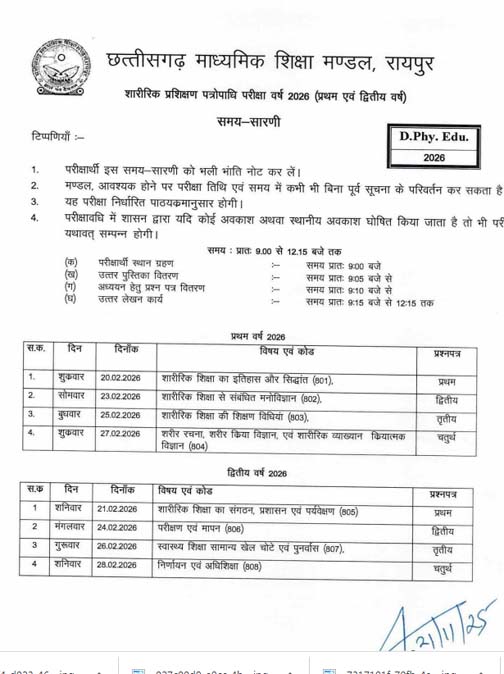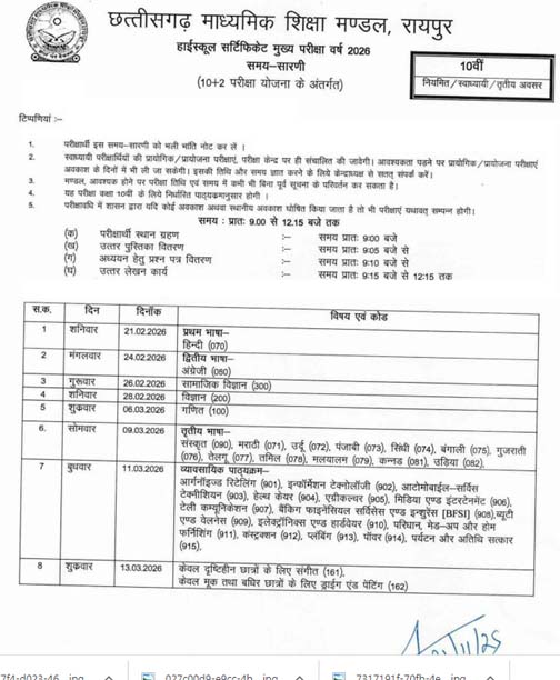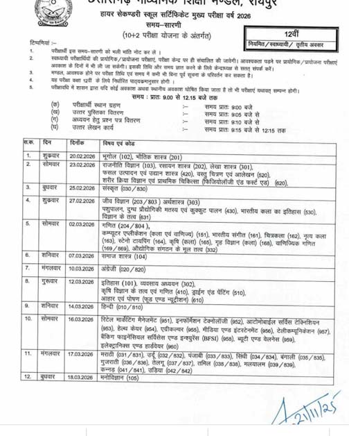 रायपुर। छत्तीसगढ़ माध्यमिक शिक्षा मण्डल, रायपुर ने मुख्य परीक्षा वर्ष 2026 के लिए हाईस्कूल, हायर सेकण्डरी तथा शारीरिक प्रशिक्षण पत्रोपाधि परीक्षाओं की समय-सारणी जारी कर दी है। हायर सेकण्डरी सर्टिफिकेट परीक्षा 20 फरवरी 2026 से 18 मार्च 2026 तक प्रातः 9 बजे से 12.15 बजे तक आयोजित होगी। हाईस्कूल सर्टिफिकेट परीक्षा 21 फरवरी 2026 से 13 मार्च 2026 तक प्रातः 9 बजे से 12.15 बजे तक संपन्न होगी। इसी प्रकार शारीरिक प्रशिक्षण पत्रोपाधि परीक्षा (प्रथम एवं द्वितीय वर्ष) 20 फरवरी 2026 से 28 फरवरी 2026 तक प्रातः 9 बजे से 12.15 बजे तक आयोजित की जाएगी। विस्तृत समय-सारणी मण्डल की आधिकारिक वेबसाइट