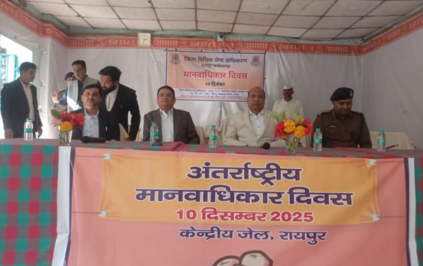 रायपुर /राष्ट्रीय विधिक सेवा प्राधिकरण नई दिल्ली एवं राज्य विधिक सेवा प्राधिकरण बिलासपुर के निर्देशानुसार आज दिनांक 10 दिसम्बर 2025 को बलराम प्रसाद वर्मा प्रधान जिला एवं सत्र न्यायाधीश / अध्यक्ष, जिला विधिक सेवा प्राधिकरण रायपुर द्वारा केन्द्रीय जेल रायपुर का निरीक्षण किया गया, जिसमें जेल नियमावली एवं माननीय उच्चतम तथा उच्च न्यायालय द्वारा समय-समय पर दिये गये दिशा निर्देशों के आलोक में बन्दियों की मूलभूत आवश्यकताओं को ध्यान में रखकर कार्य करने हेतु जेल प्रशासन को निर्देशित किया गया। उनके द्वारा जेल में बैरक, पीने के पानी की सुविधा, पाक शाला, अस्पताल का भी निरीक्षण किया गया। इसी के साथ जिला विधिक सेवा प्राधिकारण, रायपुर द्वारा मानव अधिकार दिवस के अवसर पर जेल में जागरूकता कार्यकम का भी आयोजन किया गया था, जिसमें अध्यक्ष, जिला विधिक सेवा प्राधिकरण रायपुर द्वारा जेल में निरूद्ध बंदियों को उनके संवैधानिक अधिकारों जैसेः- निःशुल्क अधिवक्ता प्राप्त करने का अधिकार, जमानत का अधिकार, अपील दायर करने एवं अन्य कानूनी अधिकारों के बारे में विस्तृत रूप से जानकारी दी गयी। इस अवसर पर शिक्षा के अधिकार के तहत् जेल में निरूद्ध बंदियो द्वारा पढ़ाई जारी रखते हुए हाई स्कूल, हायर सेकेण्डरी एवं स्नातक परीक्षा उत्तीर्ण करने तथा प्रधान मंत्री कौशल विकास योजना अंतर्गत प्रशिक्षण प्राप्त करने वाले बंदियों को माननीय प्रधान एवं जिला न्यायाधीश द्वारा प्रमाण पत्र वितरीत कर समाज की मुख्य धारा में जुड़ने के लिए प्रोत्साहित किया गया। उक्त कार्यक्रम में मुख्य रूप से आनंद कुमार सिंह मुख्य न्यायिक मजिस्ट्रेट रायपुर, अविनाश कुमार दुबे सचिव जिला विधिक सेवा प्राधिकरण, योगेश क्षत्रिय जेल अधीक्षक एवं जेल प्रशासन के अन्य अधिकारी एवं कर्मचारी उपस्थित रहे।