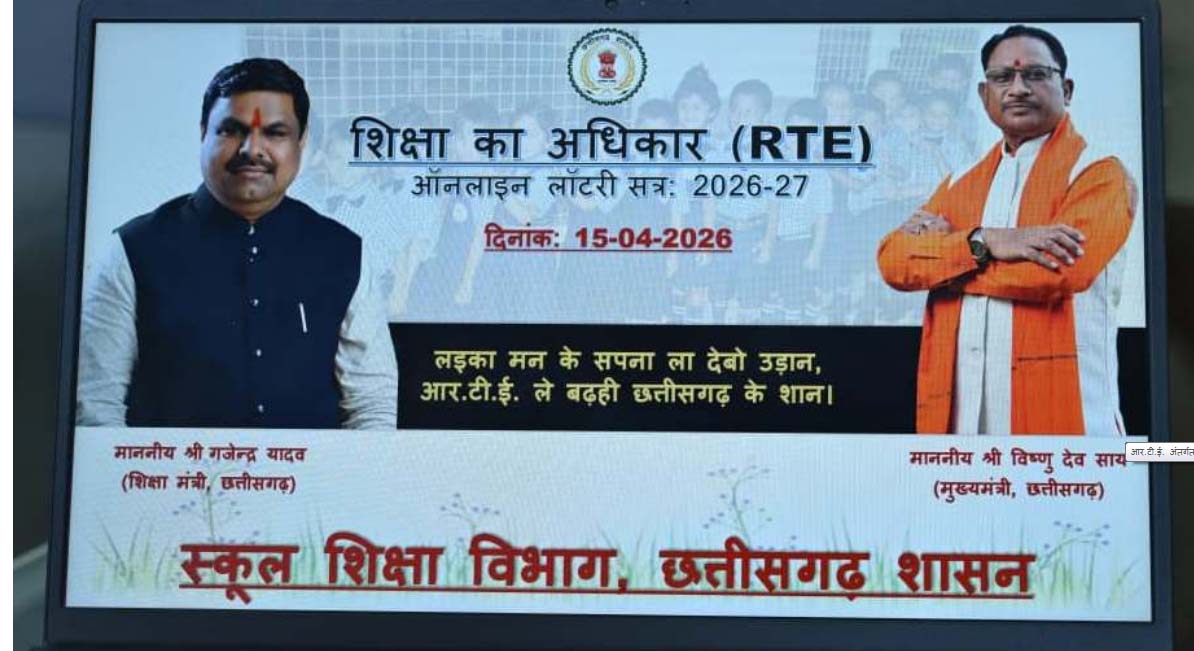 रायपुर। छत्तीसगढ़ शासन के स्कूल शिक्षा विभाग द्वारा आज दिनांक 15 अप्रैल 2026 को पूर्व निर्धारित समय-सारणी के अनुसार आर.टी.ई. अंतर्गत निजी विद्यालयों में प्रवेश हेतु प्राप्त आवेदनों की चयन सूची ऑनलाइन लॉटरी के माध्यम से मंत्रालय महानदी भवन के मुख्यमंत्री कक्ष से जारी की गई। यह प्रक्रिया मुख्यमंत्री, छत्तीसगढ़ शासन द्वारा शिक्षा मंत्री की उपस्थिति में सम्पन्न कराई गई। इस अवसर पर तकनीकी शिक्षा मंत्री श्री गुरु खुशवंत साहेब, स्कूल शिक्षा विभाग के सचिव श्री सिद्धार्थ कोमल परदेशी , उपसंचालक लोक शिक्षण श्री अशोक नारायण बंजारा ,आर टी ई प्रभारी श्री महेश नायक सहित अन्य वरिष्ठ अधिकारी उपस्थित रहे।