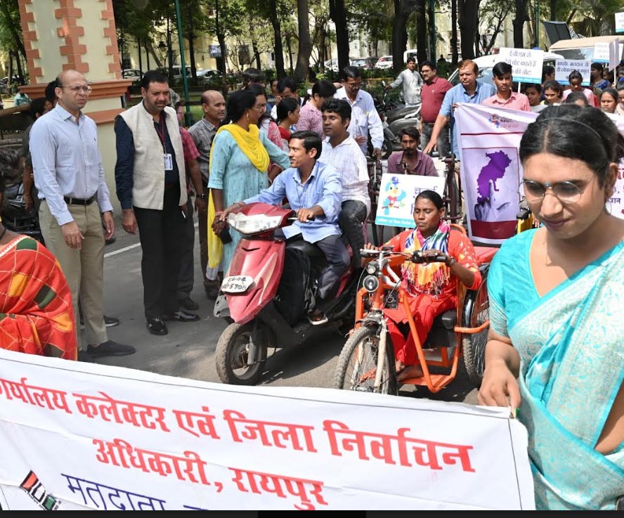 रायपुर / विधानसभा निर्वाचन 2023 के परिप्रेक्ष्य में आज कलेक्ट्रेट चौक से राजभवन चौक तक दिव्यांगजनों और थर्ड जेंडर द्वारा मतदाता जागरूकता रैली निकाली गई। उनके द्वारा आमजनों से मतदान करने की अपील की गई। इसमें कलेक्टर नरेन्द्र सर्वेश्वर भुरे, दक्षिण विधानसभा के प्रेक्षक डॉ. जी. लक्ष्मीशा, आरंग विधानसभा के प्रेक्षक श्री मीर तारिक अली सहित अन्य अधिकारीगण उपस्थित थे।