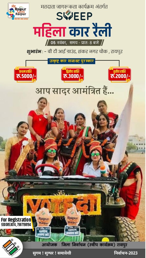 रायपुर। कलेक्टर एवं जिला निर्वाचन अधिकारी डॉ. सर्वेश्वर नरेन्द्र भुरे के मार्गदर्शन में स्थानीय मतदाताओं को मतदान हेतु प्रेरित करने 05 नवंबर को बी.टी.आई. ग्राउंड शंकर नगर चौक से महिलाओं की “स्वीप कार रैली“ का आयोजन किया गया है। यह रैली रविवार सुबह 8 बजे शुरू होगी और मुख्य मार्ग से गुजरते हुए साइंस कॉलेज मैदान जी.ई. रोड पर इसका समापन होगा। कार रैली में स्थानीय महिलाएं शामिल रहेंगी। रैली में सम्मिलित कारों को मतदान जागरूकता स्लोगन से सजाया जाएगा, सर्वश्रेष्ठ संदेश देने वाले महिला कार चालकों को जिला प्रशासन द्वारा पुरस्कृत किया जाएगा। कार रैली में सम्मिलित होने की इच्छुक महिलाएं दूरभाष क्र. 9300853074 एवं 7987198194 पर संपर्क कर अपना पंजीयन करा सकते हैं। कार रैली में राज्य निर्वाचन, जिला निर्वाचन, पुलिस, नगर निगम, महिला एवं बाल विकास विभाग, शिक्षा, स्वास्थ्य सहित समस्त विभागों के अधिकारी-कर्मचारी भी सम्मिलित होंगे।