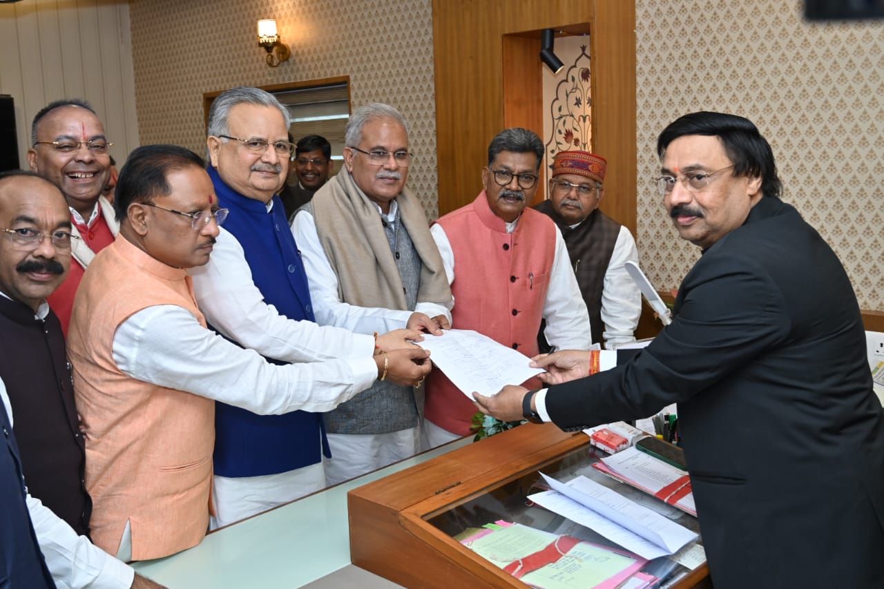 इसके उपरांत मुख्यमंत्री विष्णु देव साय, उपमुख्यमंत्री अरुण साव, रायपुर दक्षिण के विधायक और भाजपा के वरिष्ठ नेता बृजमोहन अग्रवाल, पूर्व मुख्यमंत्री भूपेश बघेल, नेता प्रतिपक्ष डॉ चरण दास महंत समेत तमाम शीर्ष नेता विधानसभा भवन पहुंचे, जहां इन सभी नेताओं की उपस्थिति में राजनांदगांव से विधायक और भारतीय जनता पार्टी के राष्ट्रीय उपाध्यक्ष डॉ रमन सिंह ने विधानसभा सचिव दिनेश शर्मा को सदन के अध्यक्ष पद के लिए नामांकन सौंपा।