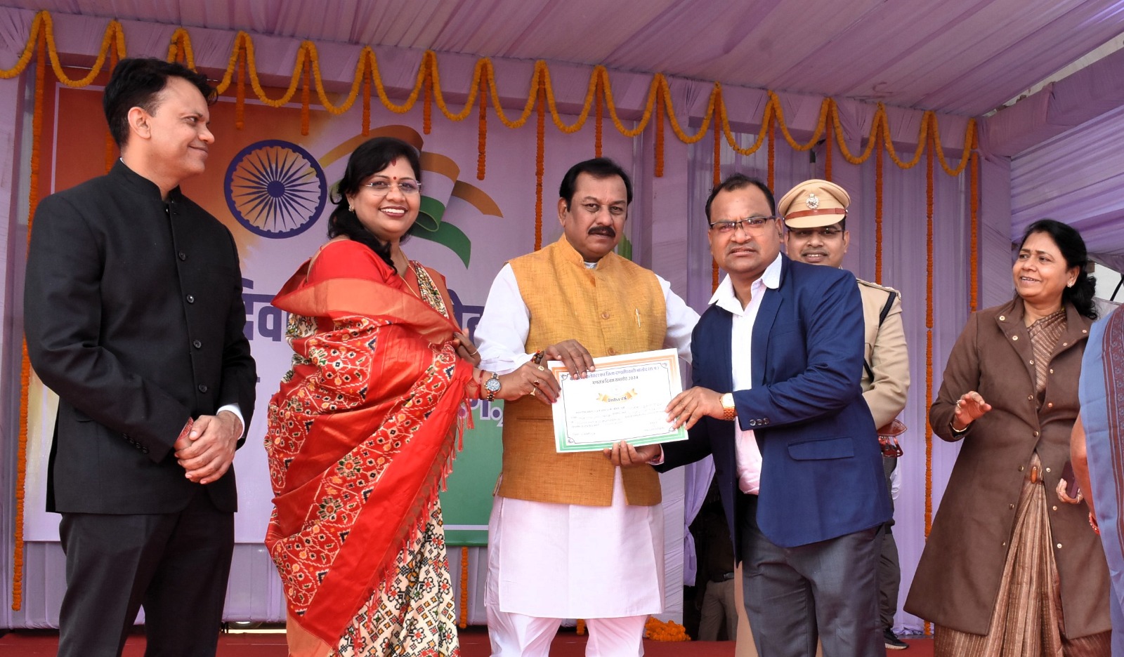 बालोद.जिला मुख्यालय बालोद के स्व. सरयू प्रसाद अग्रवाल स्टेडियम में आयोजित गणतंत्र दिवस के मुख्य समारोह में आज जिला जनसंपर्क कार्यालय बालोद के अधिकारी-कर्मचारियों का उत्कृष्ट कार्यों के लिए सम्मान किया गया। इस अवसर पर मुख्य अतिथि सांसद श्री विजय बघेल एवं अतिथियों के द्वारा जनसंपर्क अधिकारी श्री चन्द्र्रेश कुमार ठाकुर एवं वाहन चालक श्री राजेन्द्र कंुजाम को प्रशस्ति पत्र प्रदान कर सम्मानित किया गया। इस दौरान विधायक श्रीमती संगीता सिन्हा, कलेक्टर श्री इन्द्रजीत सिंह चन्द्रवाल, पुलिस अधीक्षक श्री जितंेद्र कुमार यादव, जिला पंचायत की मुख्य कार्यपालन अधिकारी डाॅ. रेणुका श्रीवास्तव एवं अन्य अतिथिगण उपस्थित थे।