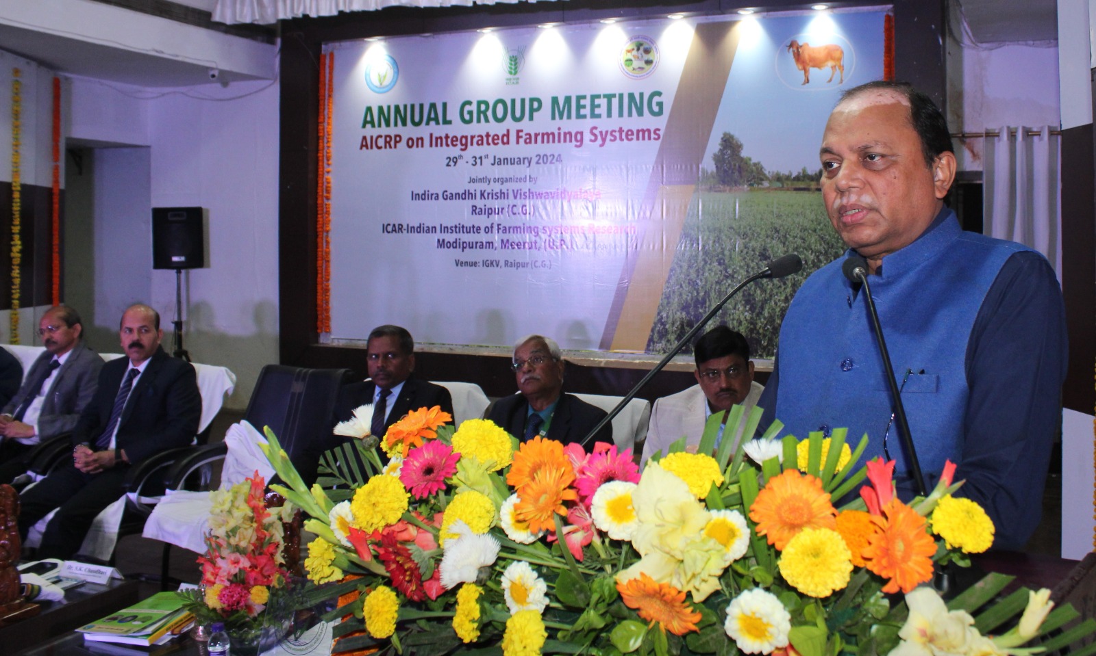 कार्यक्रम की अध्यक्षता करते हुए इंदिरा गांधी कृषि विश्वविद्यालय के कुलपति डॉ. गिरीश चंदेल ने कहा कि कृषि एवं कृषकों के विकास के समन्वित कृषि प्रणाली एक बेहतरीन मॉडल है। इस प्रणाली के तहत किसान के पास उपलब्ध समस्त संसाधनों - मानव संसाधन, पशु संसाधन, यंत्र एवं उपकरण, बीज, खाद, उर्वरक, सिंचाई जल आदि का समुचित उपयोग किया जाता है। उन्होंने कहा कि इस मॉडल को और अधिक सफल बनाने के लिए इसमें कृषि के क्षेत्र में इस्तेमाल होने वाले नवाचारों एवं आधुनिक तकनीकों जैसे ड्रोन टेक्नोलॉजी, आर्टिफिशियल इंटेलिजेन्स आदि का भी उपयोग किया जाना चाहिए। डॉ. चंदेल ने कहा कि किसानों की आय बढ़ाने के लिए फसलों एवं उनके उत्पादों की बेहतर मार्केटिंग पर ध्यान देना होगा। उन्होंने इंदिरा गांधी कृषि विश्वविद्यालय द्वारा समन्वित कृषि प्रणाली के क्षेत्र में किये जा रहे अनुसंधान कार्यां के बारे में भी जानकारी प्रदान की। कार्यक्रम में डॉ. एन. रविशंकर, परियोजना समन्वयक, अखिल भारतीय कृषि अनुसंधान परियोजना (समन्वित कृषि प्रणाली), डॉ. सुनील कुमार, निदेशक, भारतीय कृषि प्रणाली अनुसंधान संस्थान, मोदीपुरम, डॉ. पी.के. घोष, निदेशक, राष्ट्रीय जैविक तनाव प्रबंधन संस्थान, रायपुर तथा डॉ. विवेक कुमार त्रिपाठी, संचालक अनुसंधान इंदिरा गांधी कृषि विश्वविद्यालय ने भी अपने विचार व्यक्त किये।