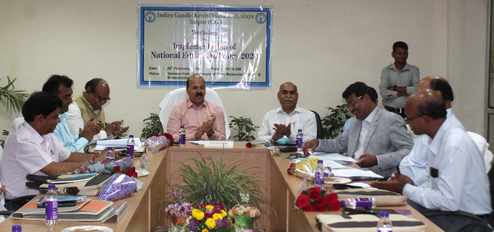 उल्लेखनीय है कि भारतीय कृषि अनुसंधान परिषद नई दिल्ली द्वारा देश के कृषि विश्वविद्यालय में नवीन राष्ट्रीय शिक्षा नीति 2020 के प्रावधानों को लागू करने के निर्देश दिए गए हैं तथा कृषि विश्वविद्यालय में नवीन शिक्षा नीति के प्रावधानों को लागू करने पर जोर दिया जा रहा है। भारतीय कृषि अनुसंधान परषिद द्वारा देश के विभिन्न कृषि विश्वविद्यालयों में नवीन राष्ट्रीय शिक्षा नीति लागू करने हेतु एक 11 सदस्यी उच्च स्तरीय समिति गठित की गई है जो शीघ्र ही इस संबंध में अपनी रिपोर्ट प्रस्तुत करेगी। छत्तीसगढ़ सरकार द्वारा भी राज्य के विश्वविद्यालयों में नवीन राष्ट्रीय शिक्षा नीति लागू करने पर बल दिया जा रहा है। कार्यशाला में कृषि महाविद्यालय के अधिष्ठाता डॉ. जी.के. दास, कृषि अभियांत्रिकी महाविद्यालय के अधिष्ठाता डॉ. विनय पाण्डेय, खाद्य प्रौद्योगिकी महाविद्यालय के अधिष्ठाता डॉ. ए.के. दवे, इंदिरा गांधी कृषि विश्वविद्यालय के संचालक अनुसंधान डॉ. विवेक कुमार त्रिपाठी, निदेशक विस्तार डॉ. अजय वर्मा, निदेशक प्रक्षेत्र एवं बीज डॉ. एस.एस. टुटेजा, अधिष्ठाता छात्र कल्याण डॉ. संजय शर्मा उपस्थित थे। कार्यक्रम संयोजक द्वय डॉ. एम.पी. ठाकुर एवं डॉ. एस.बी. वेरूलकर ने नवीन राष्ट्रीय शिक्षा नीति क्रियान्वयन की कार्ययोजना प्रस्तुत की।