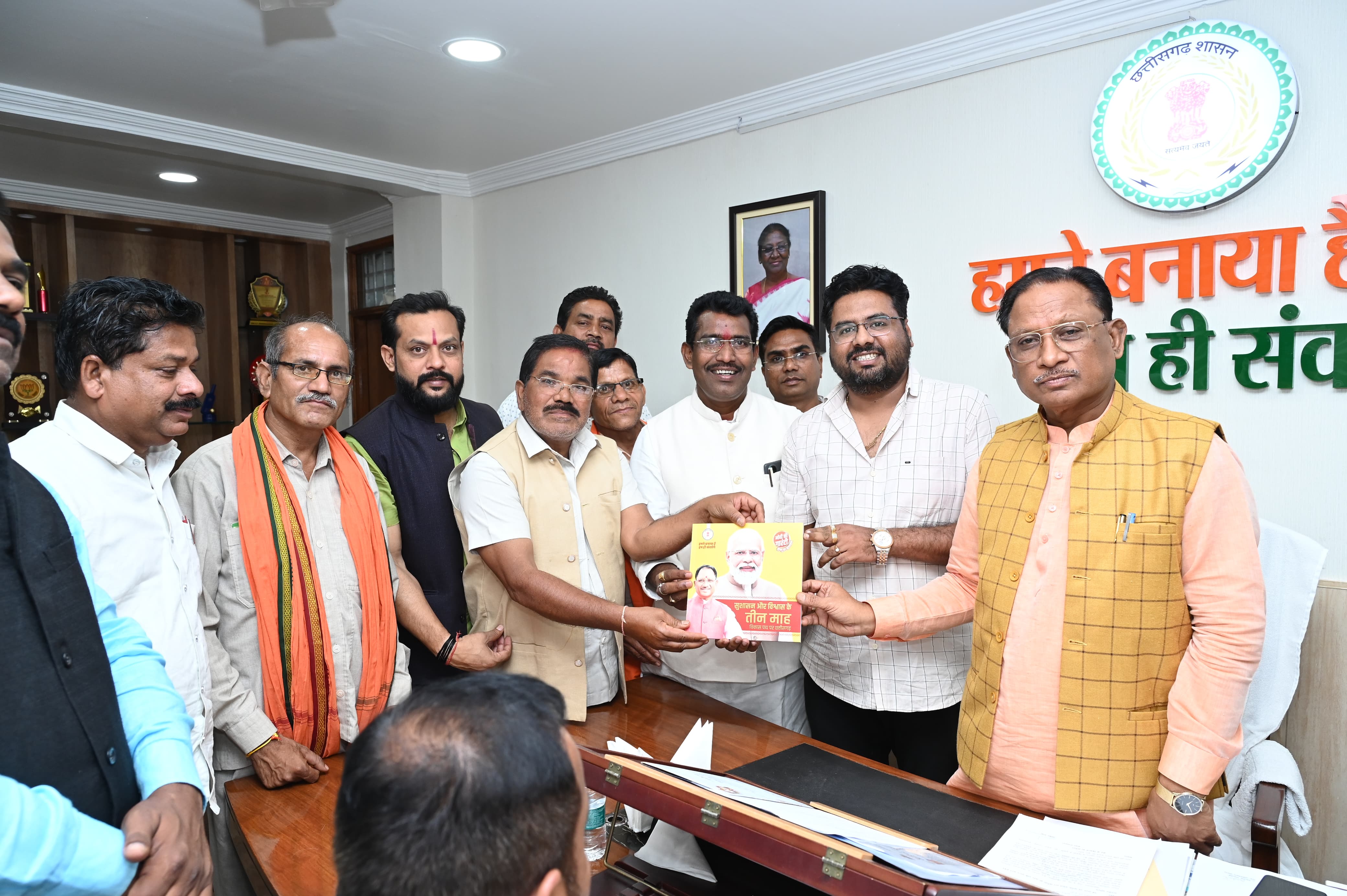 प्रतिनिधिमंडल ने छत्तीसगढ़ सरकार के तीन माह के कार्यों पर हर्ष व्यक्त करते हुए मुख्यमंत्री से कहा कि राज्य की माता बहनों के लिए सरकार ने महतारी वंदन योजना लागू कर दी है। जिसके तहत 70 लाख से अधिक माताओं के खाते में ₹1000 के मान से 655 करोड़ से अधिक की राशि ट्रांसफर की गई है। युवाओं के लिए प्रतियोगी परीक्षाओं में पारदर्शिता सुनिश्चित की गई है। पीएससी की पिछली परीक्षाओं में हुई गड़बड़ियों की जांच सीबीआई को सौंपने का निर्णय लिया गया है।अयोध्या में भगवान श्रीराम का दर्शन करने के लिए श्रीरामलला दर्शन योजना शुरू हुई है। नक्सल प्रभावित इलाकों में विकास के लिए नियद नेल्लानार यानी आपका अच्छा गांव योजना प्रारंभ हुई है। इस तरह छत्तीसगढ़ सुशासन और विकास के पथ पर बहुत तेजी से अग्रसर है।