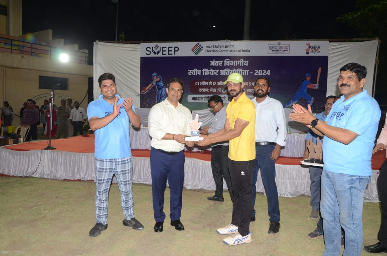 रायपुर । रायपुर के सुभाष स्टेडियम में लोकसभा निर्वाचन 2024 के स्वीप कार्यक्रम के तहत चौथे दिन अंतर विभागीय स्वीप क्रिकेट प्रतियोगिता में जिला पंचायत विभाग और स्वास्थ्य विभाग के मध्य खेला गया। इस रोमांचकारी मुकाबले में स्वास्थ्य विभाग की टीम ने जीत हासिल की। मतदाता जागरूकता के तहत आयोजित क्रिकेट प्रतियोगिता में कलेक्टर एवं जिला निर्वाचन अधिकारी डाॅ. गौरव सिंह भी शामिल हुए। प्रतियोगिता के अंतिम में नगरीय प्रशासन विभाग के संचालक श्री कुंदन कुमार ने उपस्थित नागरिकों को मतदाता जागरूकता की शपथ भी दिलाई।