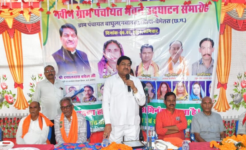 रायपुर /खाघ मंत्री श्री दयालदास बघेल ने शनिवार को बेमेतरा जिले के नवागढ़ विकास खंड के ग्राम बाघुल में 18 लाख 63 हजार की लागत से नवीन ग्राम पंचायत भवन का शुभारंभ किया। खाघ मंत्री श्री बघेल ने शुभारंभ अवसर पर सभी को अपनी हार्दिक बधाई और शुभकामनाएं दी। उन्होंने कहा कि पंचायत को मजबूत करने के लिए बाघुल गांव को नया पंचायत भवन दिया गया है। इसका उपयोग गांव के सरपंच, पंच और आम लोग बैठक, प्रशिक्षण देने के लिए कर सकेंगे। इस अवसर पर सरपंच बाघुल श्रीमती उर्वशी अर्जुन सिंग लसेल, मीना रामनाथ, श्री टार्जन साहू, श्री चंद्रपाल साहू, श्री अजय साहू, श्री परस वर्मा, श्री खोरबाहरा साहू और बड़ी संख्या में ग्रामवासी उपस्थित थे।