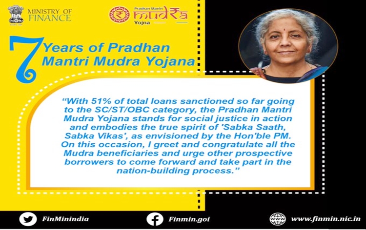 प्रधानमंत्री मुद्रा योजना के सात वर्ष पूरे, योजना के तहत अब तक 18 लाख 60 हजार करोड रूपये की राशि स्वीकृत