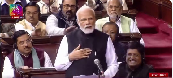 ज्ञात हो कि राष्ट्रपति के अभिभाषण पर हुई चर्चा के दौरान अधिकतर विपक्षी दलों ने अडाणी समूह को लेकर अमेरिकी वित्तीय शोध कंपनी हिंडनबर्ग रिसर्च की ओर से लगाए गए आरोपों का उल्लेख किया और इसकी जांच के लिए संयुक्त संसदीय समिति (जेपीसी) गठित करने की मांग की। प्रधानमंत्री ने करीब एक घंटा और 25 मिनट के अपने पूरे भाषण के दौरान सरकार की विभिन्न महत्वाकांक्षी योजनाओं का उल्लेख करते हुए उसकी उपलब्धियां गिनाईं और कांग्रेस सहित अन्य विपक्षी दलों पर भी निशाना साधा। उनके पूरे भाषण के दौरान विपक्षी दलों द्वारा की गई नारेबाजी के जवाब में प्रधानमंत्री ने कहा कि वह एक घंटे से अधिक समय से अकेले बोल रहे हैं और विपक्ष के लोगों को नारेबाजी करने के लिए एक दूसरे का सहारा लेना पड़ रहा है। उन्होंने कहा, ‘‘एक अकेला कितनों पर भारी पड़ रहा है... नारे बदलने के लिए उन्हें बदलना पड़ रहा है... घंटे भर से आवाज नहीं रोक पाए हैं क्योंकि देश के लिए जीता हूं... देश के लिए कुछ करने के लिए निकला हूं।'' उन्होंने विपक्षी सदस्यों पर हमला करते हुए कहा कि राजनीतिक खेल खेलने वाले लोगों के अंदर वह हौसला नहीं है। उन्होंने कहा, ‘‘वे बचने का रास्ता खोज रहे हैं।'' प्रधानमंत्री ने कहा कि उनकी सरकार ने विकसित भारत का लक्ष्य रखा है और वह इस संकल्प को पूरा करने की ओर बढ़ रही है। उन्होंने कहा, ‘‘यह हम सबका संकल्प है। अब देश पीछे मुड़कर देखने को तैयार नहीं है। देश लंबी छलांग मारने को तैयार है।'' कांग्रेस पर लोगों की समस्याओं का समाधान ना करने का आरोप लगाते हुए प्रधानमंत्री ने कहा कि उनकी सरकार, आजाद भारत के लिए जो सपने देखे गए थे, उन्हें पूरा करने के लिए संकल्पित होकर काम कर रही है। प्रधानमंत्री ने कहा कि केंद्र सरकार योजनाओं का शत प्रतिशत लोगों तक लाभ पहुंचाने के लक्ष्य की दिशा में आगे बढ़ रही है। उन्होंने कहा कि इससे भेदभाव की सारी गुंजाइश खत्म होती है, भ्रष्टाचार की संभावनाएं समाप्त होती हैं और तुष्टिकरण की आशंकाएं खत्म होती हैं। उन्होंने कहा, ‘‘सच्ची पंथनिरपेक्षता अगर कुछ है... सच्ची धर्मनिरपेक्षता कुछ है तो यही है। यही सेक्युलरिज्म है। सबका साथ, सबका विकास का मतलब भी यही है...शत प्रतिशत सेवा अभियान सामाजिक न्याय का बहुत बड़ा सशक्त माध्यम है। यही सामाजिक न्याय की असली गारंटी है। यही सच्ची पंथनिरपेक्षता है।'' प्रधानमंत्री ने कहा कि भाजपा के नेतृत्व वाली केंद्र सरकार ने देश को विकास का ऐसा मॉडल दिया, जिसमें सभी हितधारकों को उनका शत प्रतिशत हक मिले। कांग्रेस पर निशाना साधते हुए उन्होंने कहा, ‘‘इसलिए देश हमारे साथ है और कांग्रेस को बार-बार खारिज किया जा रहा है। लेकिन इसके बावजूद कांग्रेस और उसके साथी साजिशों से बाज नहीं आते। जनता देख रही है 
