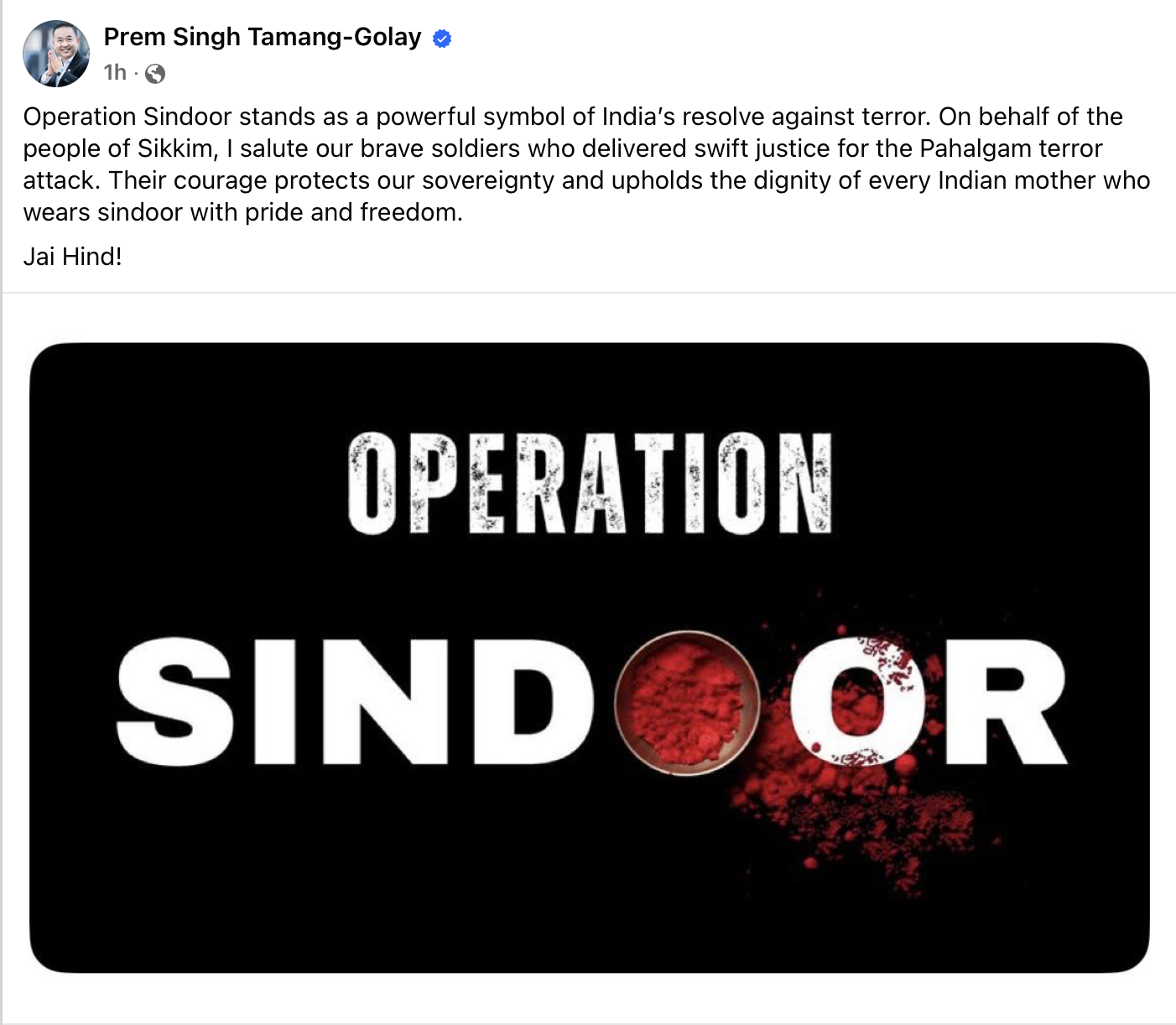 मुख्यमंत्री ने आज सुबह सोशल मीडिया फेसबुक पर एक पोस्ट में कहा, ‘ऑपरेशन सिंदूर’ आतंकवाद के खिलाफ भारत की दृढ़ संकल्प का एक शक्तिशाली प्रतीक है। सिक्किम की जनता की ओर से देश के उन बहादुर सैनिकों को सलाम, जिन्होंने पहलगाम आतंकवादी हमले में त्वरित न्याय दिलाया।’