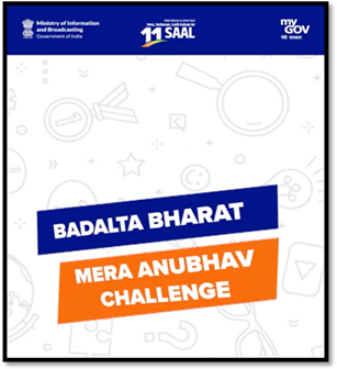 नई दिल्ली। प्रधानमंत्री नरेंद्र मोदी के नेतृत्व में भारत में हुए 11 वर्षों के परिवर्तनकारी बदलावों का उत्सव मनाने के लिए सूचना एवं प्रसारण मंत्रालय ने MyGov के साथ मिलकर एक रचनात्मक राष्ट्रव्यापी अभियान बदलता भारत मेरा अनुभव शुरू किया है। यह अभियान देश के सभी नागरिकों को भारत के बदलावों को रचनात्मक ढंग से प्रस्तुत करने का अवसर देता है। इस अभियान में पांच अनोखी प्रतियोगिताएं शामिल की गई हैं, जिनमें भाग लेने की अंतिम तिथि 9 जुलाई 2025 है। इसमें प्रतिभागियों को आकर्षक पुरस्कार और सभी को डिजिटल प्रमाणपत्र दिए जाएंगे।