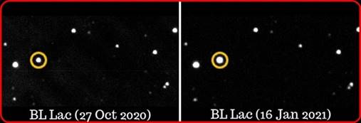 27 अक्टूबर, 2020 (आंकड़ों का बायां पैनल) को बीएल लैकेर्टे की चमक लगभग 2.95 * 1012 एलओ पाई गई। 80 दिन बाद यानी 16 जनवरी, 2021 (आंकड़े का दायां पैनल) 9 7.25 * 1012 एलओ थी यानी चमक में 9 250त्न की बढ़ोतरी हुई। यह 4 ट्रिलियन एलओ के समतुल्य है। (यहां एलओ = सूर्य की चमक)।