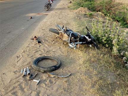 हादसा इतना भीषण था कि बाइक आगे से पूरी तरह क्षतिग्रस्त हो गई। उसका रिम, टायर और शॉकर्स अलग हो गए। जिसके हिस्से सड़क पर अलग-अलग जगह बिखर गए।