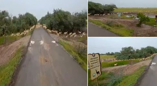 भावनगर । गुजरात के भावनगर जिले में काला हिरण राष्ट्रीय उद्यान के पास एक सड़क को पार कर रहे सैकड़ों काले हिरणों का एक वीडियो सोशल मीडिया मंचों पर खूब चर्चित हो रहा है और इस नजारे की प्रधानमंत्री नरेंद्र मोदी ने भी सराहना की। उक्त वीडियो गुजरात सूचना विभाग के आधिकारिक ट्विटर हैंडल की तरफ से बुधवार को साझा किया गया।