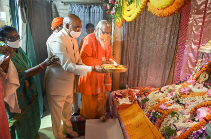 अयोध्या। राष्ट्रपति रामनाथ कोविंद ने अपने परिवार के साथ रविवार को यहां श्री राम जन्मभूमि परिसर में रामलला के दर्शन किए। पुजारियों के मंत्रोच्चार के जाप के बीच उन्होंने पूजा-अर्चना और आरती भी की। पूजा के बाद राष्ट्रपति के माथे पर तिलक लगाया गया। मंदिर के पुजारी ने राष्ट्रपति को एक शॉल भेंट की और राष्ट्रपति ने उनसे संक्षिप्त बातचीत की। इसके बाद उन्होंने एक पौधा लगाया। कोविंद को राम मंदिर की एक लघु प्रतिकृति भी भेंट की गई। राष्ट्रपति ने अपने परिवार के सदस्यों के साथ हनुमानगढ़ी मंदिर का दौरा भी किया और पूजा-अर्चना की। हनुमानगढ़ी मंदिर में पूजा-अर्चना करने के बाद राष्ट्रपति को गुलाबी रंग की पगड़ी भेंट की गई। इस अवसर पर उनके साथ उत्तर प्रदेश की राज्यपाल आनंदीबेन पटेल, राज्य के मुख्यमंत्री योगी आदित्यनाथ, दोनों उपमुख्यमंत्री केशव प्रसाद मौर्य और दिनेश शर्मा भी मौजूद थे। शहर में लोग अपने घरों की छतों पर राष्ट्रपति की झलक पाने के लिए खड़े देखे गए।