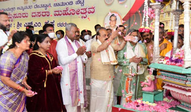 मैसूरु । लगातार दूसरे साल कोविड-19 महामारी के प्रकोप के बीच मैसूरु का 10 दिन चलने वाला प्रसिद्ध दशहरा उत्सव बृहस्पतिवार को धार्मिक रीति रिवाज से शुरू हुआ। ‘नाद हब्बा' (राजकीय पर्व) के नाम से प्रसिद्ध इस उत्सव में पूर्व मुख्यमंत्री एस एम कृष्णा और मुख्यमंत्री बसवराज बोम्मई के साथ अन्य गणमान्य लोग शामिल हुए जिन्होंने देवी चामुंडेश्वरी की प्रतिमा पर पुष्प वर्षा की। देवी चामुंडेश्वरी का मंदिर चामुंडी पहाड़ी पर स्थित है और उन्हें मैसूरु के राजपरिवार की कुलदेवी माना जाता है। पूर्व विदेश मंत्री और महाराष्ट्र के पूर्व राज्यपाल रह चुके एस एम कृष्णा को सरकार की ओर से दशहरा पर्व का उद्घाटन करने के लिए आमंत्रित किया गया था। मैसूरु प्रभारी और सहकारिता मंत्री एस टी सोमशेखर, राजस्व मंत्री आर अशोक, कन्नड और संस्कृति मंत्री वी सुनील कुमार, धार्मिक अनुदान, वक्फ और हज मंत्री शशिकला जोले और मैसूरु के सांसद प्रताप सिम्हा भी इस मौके पर मौजूद रहे। कोविड-19 महामारी के कारण सरकार ने 412वां दशहरा पर्व सादे तरीके से मनाने का निर्णय लिया था। राज्य सरकार ने मैसूरु में दशहरा मनाने के लिए दिशा निर्देश जारी किये हैं जिसके अनुसार, प्रमुख स्थलों पर त्यौहार मनाने के लिए 500 से ज्यादा लोग एकत्र नहीं हो सकते। देवी चामुंडेश्वरी की सेवा करने को “सौभाग्य” बताते हुए मुख्यमंत्री बोम्मई ने कहा कि कोविड के कारण दो साल तक विश्व प्रसिद्ध दशहरा धूमधाम से नहीं मनाया जा सका। उन्होंने कहा, “मैंने देवी से प्रार्थना की है कि कोविड महामारी और सभी समस्याओं से राज्य के लोगों की रक्षा करें।” एस एम कृष्णा ने अपने भाषण में कहा कि युवा राष्ट्र की संपत्ति हैं और उन्हें सही दिशा मिलनी चाहिए। मैसूरु के साथ अपने संबंधों को याद करते हुए उन्होंने राजपरिवार द्वारा मैसूरु में किये गये योगदान का स्मरण किया।
