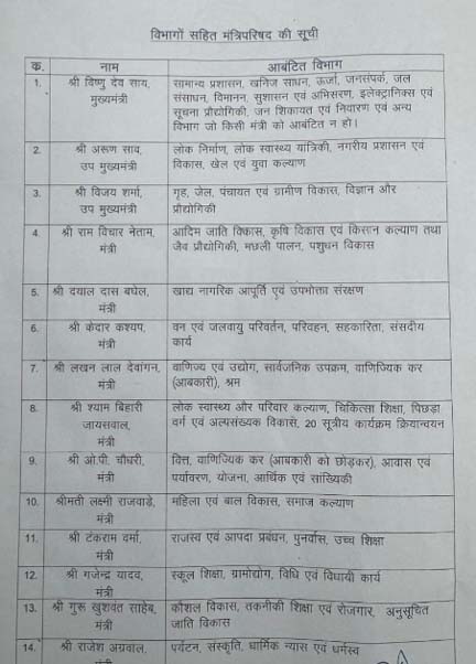 राजभवन में राज्यपाल रमेन डेका ने बीजेपी के तीन विधायकों राजेश अग्रवाल, गुरु खुशवंत साहेब और गजेंद्र यादव को मंत्री पद की शपथ दिलाई.किसे मिला कौन सा विभाग?नव नियुक्त मंत्री गजेंद्र यादव- स्कूल शिक्षा, ग्राम उद्योग, विधि एवं विधायी कार्यमंत्री खुशवंत साहेब- कौशल विकास, तकनीकी शिक्षा एवं रोजगार, अनुसूचित जाति विकासमंत्री राजेश अग्रवाल को पर्यटन, संस्कृति, धार्मिक न्यास एवं घर्मस्वदेखें कैबिनेट मंत्रियों के विभागों की पूरी सूची