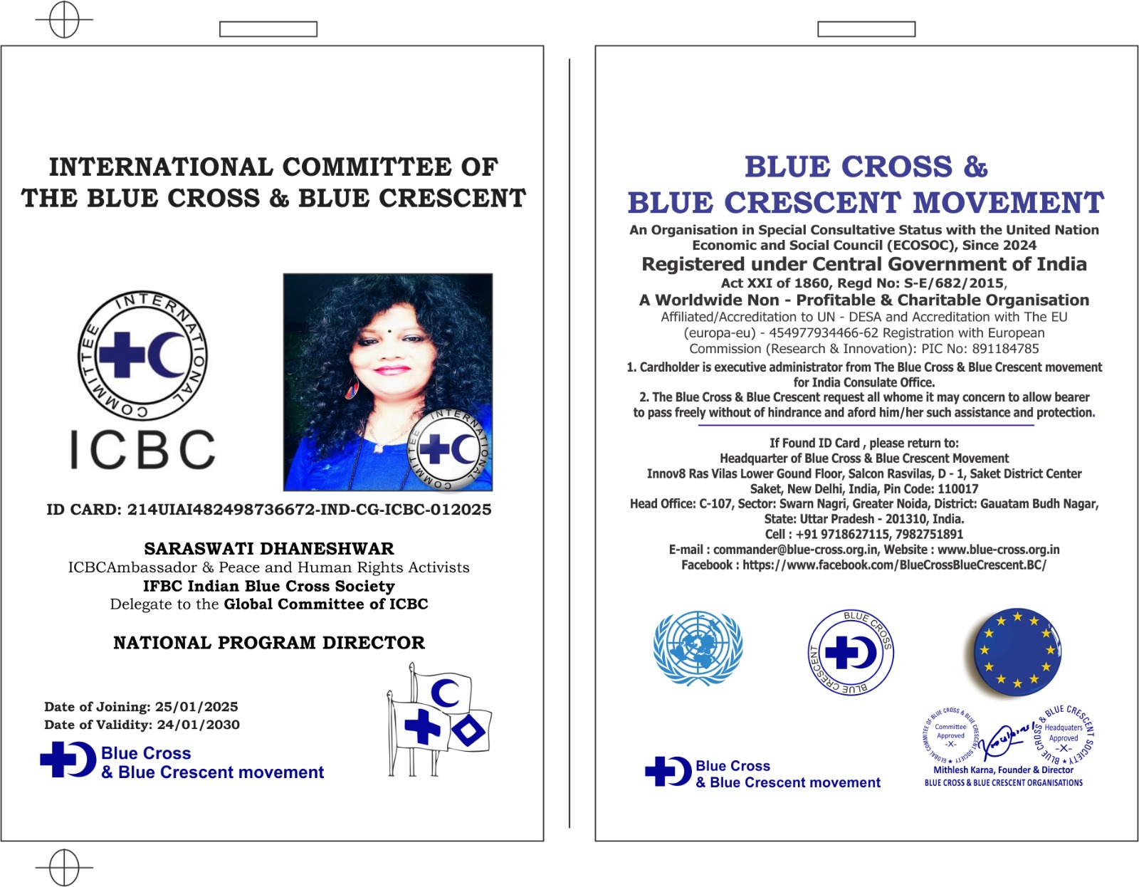 भिलाई नगर। ब्लू क्रॉस एवं ब्लू क्रिसेंट ऑर्गनाइजेशन्स के फाउंडर एवं कमांडर डायरेक्टर मिथिलेश कारना ने आईसीबीसी की राष्ट्रीय कार्यक्रम निदेशक के रूप में तालपुरी की सरस्वती धानेश्वर को नियुक्त किया है। यह नियुक्ति पांच वर्षों के लिए होगी। उनकी नियुक्ति की जानकारी देते हुए कारना ने बताया कि यह संगठन संयुक्त राष्ट्रसंघ के साथ मिलकर एक विशेष सलाहकार समिति के तहत कार्य करता है, जिसे दुनिया के दस संगठनों में विशेष दर्जा प्राप्त है। बता दें कि यह भारत सरकार के अंतर्गत पंजीकृत गैर लाभकारी और धर्मार्थ संगठन है। इसका उद्देश्य है शांति एवं मानवाधिकारों की रक्षा के साथ वैश्विक स्तर पर मानवाधिकारों की दृढ़ता से वकालत करना। इसके अलावा यह संगठन प्राकृतिक आपदाओं से प्रभावित लोगों की मदद करने में महत्वपूर्ण भूमिका भी निभाता है। विदित हो कि सरस्वती धानेश्वर पिछले बारह सालों से मानवाधिकार एवं विश्व शांति समिति, भारत के साथ जुड़कर शांति एवं मानवता के लिए कार्य कर रही हैं, उनकी इस उपलब्धि पर संगठन के फाउंडर डायरेक्टर मिथिलेश कारना एवं संरक्षक जगदीश तपिश जी ने बधाई दी है।