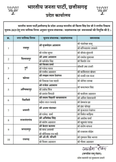 रायपुर। छत्तीसगढ़ में भारतीय जनता पार्टी ने नगरीय निकाय चुनावों को लेकर चुनाव संचालक और समन्वयकों की नियुक्ति की है। 10 नगर पालिका निगम के लिए संचालक, उप संचालक और समन्वयकों की नियुक्ति की है। इसमें रायपुर का कमान सांसद बृजमोहन अग्रवाल और राजेश मूणत संभालेंगे। ऐसे ही अन्य जगहों में पार्टी ने दिग्गज को कमान सौंपीं है।