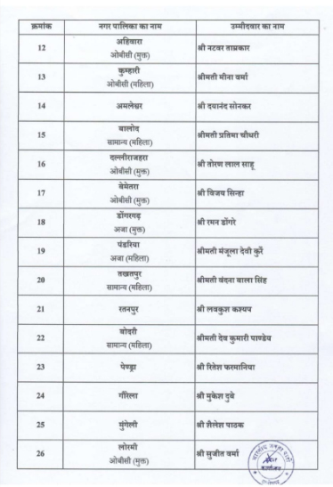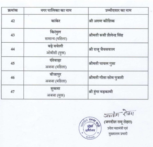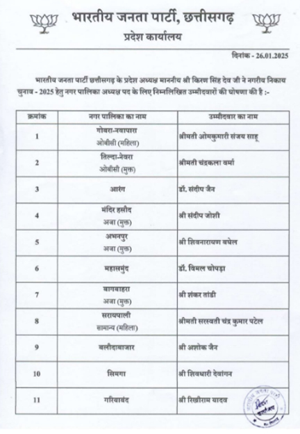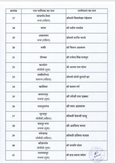 वहीं, भाजपा ने सैंतालीस नगर पालिका अध्यक्ष पद के लिए अपने प्रत्याशियों के नामों की घोषणा कर दी है। ये सभी नाम पार्टी के प्रदेश अध्यक्ष किरण सिंह देव ने जारी किए हैं।देखें पूरी लिस्ट