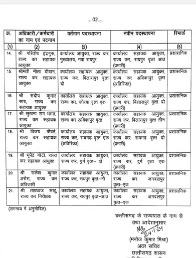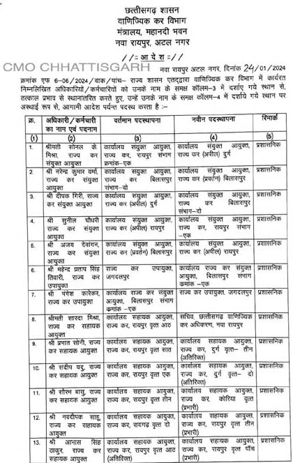 - -जीएसटी की व्यवस्था सुगम एवं सरल करने वाणिज्यिक कर विभाग के अधिकारियों/कर्मचारियों का हुआ स्थानांतरण-जीएसटी विभाग में लंबे समय से पदस्थ 21 अधिकारियों/कर्मचारियों का स्थानान्तरण आदेश जारी-बेहतर काम करने वाले अधिकारी/कर्मचारियों को मिली नई पदस्थापना व जिनके खिलाफ थी शिकायतें ऐसे लंबे समय से जमे अधिकारी और कर्मचारी हुए स्थानांतरित-विभागीय अधिकारी कर्मचारी शासन के दिशानिर्देशों का कड़ाई से पालन करें सुनिश्चितरायपुर / वाणिज्यिक कर विभाग के 21 अधिकारियों और कर्मचारियों के स्थानांतरण का आदेश जारी किया गया है।वाणिज्यिक कर जीएसटी विभाग में पदस्थ संयक्त आयुक्त राज्य कर के 5, राज्य कर उपायुक्त के 2, सहायक आयुक्त राज्य कर के 12, एक राज्य कर अधिकारी एवं एक निरीक्षक राज्य कर सहित 21 अधिकारी/कर्मचारियों के स्थानांतरण का आदेश राज्य कर आयुक्त कार्यालय द्वारा जारी किया गया है।विभागीय मंत्री श्री ओ.पी.चौधरी का कहना है कि जीएसटी विभाग व्यापारियों के साथ ही आमजनों से जुड़ा विभाग है, अतः विभाग के कार्यों में और अधिक पारदर्शिता के साथ कार्यों में तेज़ी लाने स्थानांतरण आदेश जारी किये गए हैं। उन्होंने कहा की जीएसटी विभाग द्वारा समय समय पर नियमों की जानकारी देने व्यापारियों के लिए कार्यशालाएं भी आयोजित की जाएंगी। साथ ही केंद्र सरकार द्वारा समय समय पर नियमों की जानकारी एवं इज़ ऑफ डूइंग बिज़नेस सुनिश्चित करने भी विभाग को निर्देशित किया गया है।मंत्री श्री ओ पी चौधरी ने कहा कि वाणिज्यिक कर विभाग शासन का महत्वपूर्ण विभाग है और विभाग के अधिकारियों को कड़ाई के साथ शासन के दिशानिर्देशों का पालन सुनिश्चित हो, इस बात का ध्यान रखना चाहिए। उन्होंने कहा कि कार्य में लापरवाही बरतने वाले अधिकारियों और कर्मचारियों के विरुद्ध कड़ी कार्रवाई सुनिश्चित की जाए और उत्कृष्ट कार्य करने वाले अधिकारियों और कर्मचारियों को प्रोत्साहित एवं पुरस्कृत किया जाए, जिससे कर्मचारियों में अनुशासन की भावना का विकास हो और विभागीय अधिकारियों और कर्मचारियों की कार्यक्षमता में वृद्धि हो। उन्होंने कहा कि अधिकारियों और कर्मचारियों के स्थानांतरण से विभागीय कार्यों में और अधिक पारदर्शिता के साथ सुगमता लाने के उद्देश्य से स्थानांतरण आदेश जारी किए गए हैं। इनमें से विशेष रुप से ऐसे अधिकारियों/कर्मचारियों का स्थानांतरण किया गया है जो लंबे समय से एक ही स्थान पर थे और जिनके ख़िलाफ़ लंबे समय से शिकायतें आ रही थी। साथ ही बेहतर काम करने वाले अधिकारियों और कर्मचारियों को नई पदस्थापना भी दी गई है।