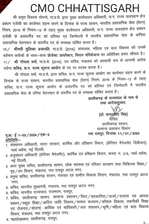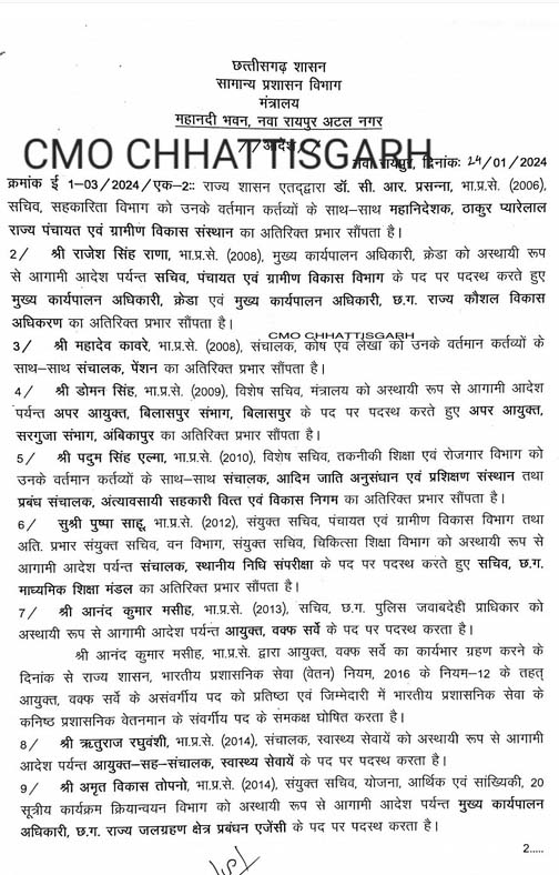 रायपुर। राज्य शासन द्वारा भारतीय प्रशासनिक सेवा के अधिकारियों के नवीन पदस्थापना आदेश जारी कर दिए गए हैं। बुधवार को कैबिनेट की हुई बैठक के बाद सामान्य प्रशासन विभाग ने ये आदेश जारी कर दिए। इनमें 11 आईएएस डॉ. सी. आर. प्रसन्ना, राजेश सिंह राणा, महादेव कावरे, डोमन सिंह, पदुम सिंह एल्मा, पुष्पा साहू, आनंद कुमार मसीह, ऋतुराज रघुवंशी, अमृत विकास तोपनो, तुलिका प्रजापति, गोपाल वर्मा शामिल हैं।