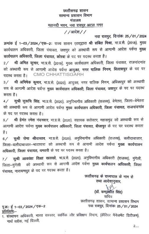 - रायपुर। राज्य शासन द्वारा भारतीय प्रशासनिक सेवा के अधिकारियों के नवीन पदस्थापना आदेश जारी कर दिए हैंं। सामान्य प्रशासन द्वारा जारी इस आदेश के अनुसार आईएएस संबित मिश्रा अब जिला पंचायत कोरबा में मुख्य कार्यपालन अधिकारी पद की जिम्मेदारी निभाएंगे। वहीं अमित कुमार को नगर पालिक निगम बिलासपुर का आयुक्त बनाया गया है। इसी तरह अभिषेक कुमार जिला पंचायत जशपुर के मुख्य कार्यपालन अधिकारी होंगे। सुरुचि सिंह जिला पंचायत राजनांदगांव की मुख्य कार्यपालन अधिकारी बनार्ई गई हैं। वहीं, हेमंत रमेश नंदनवार जिला पंचायत बीजापुर में मुख्य कार्यपालन अधिकारी बनाए गए हैं। आईएएस रोमा श्रीवास्तव जिला पंचायत धमतरी की मुख्य कार्यपालन अधिकारी और आकांक्षा शिक्षा खलखो, जिला पंचायत नारायणपुर की मुख्य कार्यपालन अधिकारी होंगी।देखें सूची-