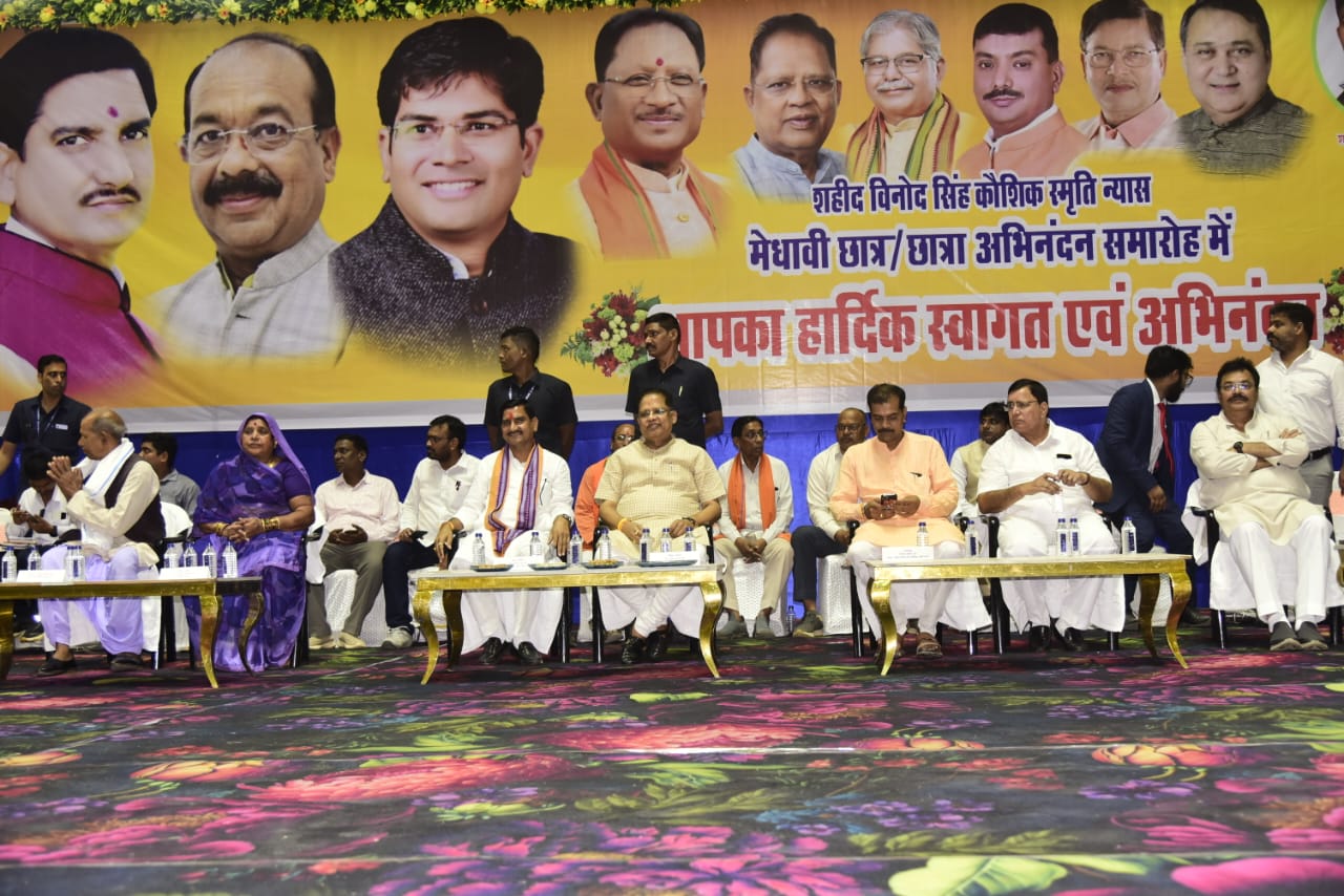 बिलासपुर/केंद्रीय आवासन एवं शहरी विकास राज्य मंत्री श्री तोखन साहू ने शहीद विनोद सिंह कौशिक की स्मृति में बहतराई मेंआयोजित एक समारोह में मेधावी छात्र छात्राओं को सम्मानित किया। कार्यक्रम का आयोजन शहीद विनोद सिंह कौशिक सेवा ट्रस्ट द्वारा किया गया। अतिथियों ने भारत माता, स्वामी विवेकानंद और शहीद विनोद सिंह कौशिक की छाया चित्र पर माल्यार्पण व दीप प्रज्ज्वलित कर समारोह का शुभारंभ किया। कार्यक्रम में हाई व हायर सेकंडरी स्कूल में 60 प्रतिशत से ज्यादा अंक पाने वाले लगभग 7 हजार छात्र छात्राओं को प्रशस्ति पत्र और मेडल देकर सम्मानित किया गया। विशिष्ट अतिथि के रूप में इस मौके पर विधायक श्री अमर अग्रवाल, श्री सुशांत शुक्ला और जिला पंचायत अध्यक्ष श्री अरुण सिंह चौहान उपस्थित थे।