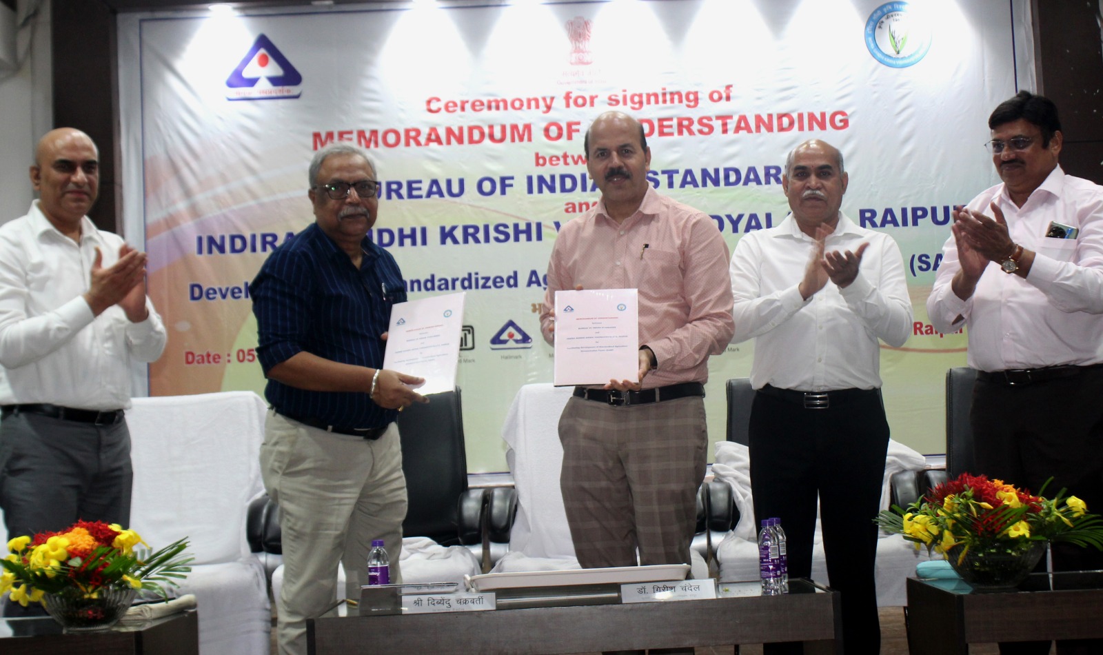 इस अवसर पर आयोजित समारोह को संबोधित करते हुए इंदिरा गांधी कृषि विश्वविद्यालय के कुलपति डॉ. गिरीश चंदेल ने कहा कि कृषि के क्षेत्र में विभिन्न अंचलों में अलग-अलग कृषि पद्धतियां एवं क्रियाओं का उपयोग किया जाता है जिसकी वजह से इसमें विविधताएं पाई जाती हैं। उन्होंने कहा कि कृषि विश्वविद्यालय के अंतर्गत संचालित विभिन्न प्रदर्शन प्रक्षेत्रों में भारतीय मानक ब्यूरो द्वारा अनुशंसित कृषि पद्धतियों एवं प्रक्रियाओं का उपयोग करने से कृषि उत्पादों की गुणवत्ता में वृद्धि होगी तथा उत्पादन में इजाफा होगा, इससे यहां होने वाले प्रदर्शनों का अवलोकन कर छत्तीसगढ़ के किसान भी लाभान्वित होंगे। डॉ. चंदेल ने कहा कि इंदिरा गांधी कृषि विश्वविद्यालय, पंत नगर कृषि विश्वविद्यालय, उत्तराखण्ड के बाद देश का ऐसा दूसरा विश्वविद्यालय बन गया है जहां भारतीय मानक ब्यूरो द्वारा अनुशंसित कृषि पद्धतियों का अनुसरण किया जाएगा। उन्होंने कहा कि सर्वप्रथम रायपुर स्थित प्रदर्शन प्रक्षेत्र में इन मानकों का उपयोग किया जाएगा और धीर-धीरे विश्वविद्यालय के अंतर्गत संचालित समस्त प्रदर्शन प्रक्षेत्रों को मानक पद्धतियों के अंतर्गत लाया जाएगा। भारतीय मानक ब्यूरो के उप महानिदेशक श्री दिव्येंदु चक्रवर्ती ने इस अवसर पर कहा कि आज का दिन इंदिरा गांधी कृषि विश्वविद्यालय तथा भारतीय मानक ब्यूरो दोनों के लिए काफी महत्वपूर्ण है जब कृषि विश्वविद्यालय द्वारा अपने प्रक्षेत्रों में ब्यूरो द्वारा निर्धारित मानकों के उपयोग हेतु समझौता किया जा रहा है। उन्होंने कहा कि भारतीय मानक ब्यूरो द्वारा विभिन्न क्षेत्रों में 22 हजार से ज्यादा मानक निर्धारित किये गये हैं जिनमें अभियांत्रिकी एवं प्रौद्योगिकी, स्वास्थ्य प्रौद्योगिकी, खाद्य प्रौद्योगिकी, खाद्य उत्पाद, ग्राहक सेवाएं, कृषि अनुसंधान आदि क्षेत्र शामिल हैं। भारतीय मानक ब्यूरो द्वारा विभिन्न उत्पादों एवं प्रक्रियाओं के लिए आई.एस.आई., हॉलमार्क जैसे मानक निर्धारित किये गये हैं जिससे ग्राहकों एवं उपयोगकर्ताओं को उत्पादों एवं सेवाओं के मानकीकृत होने का भरोसा मिलता है। उन्होंने कहा कि भारतीय मानक ब्यूरो द्वारा देश के 100 से अधिक शैक्षणिक संस्थानों के साथ में शिक्षा एवं अनुसंधान के क्षेत्रों में अनेक अनुबंध किये गये हैं।