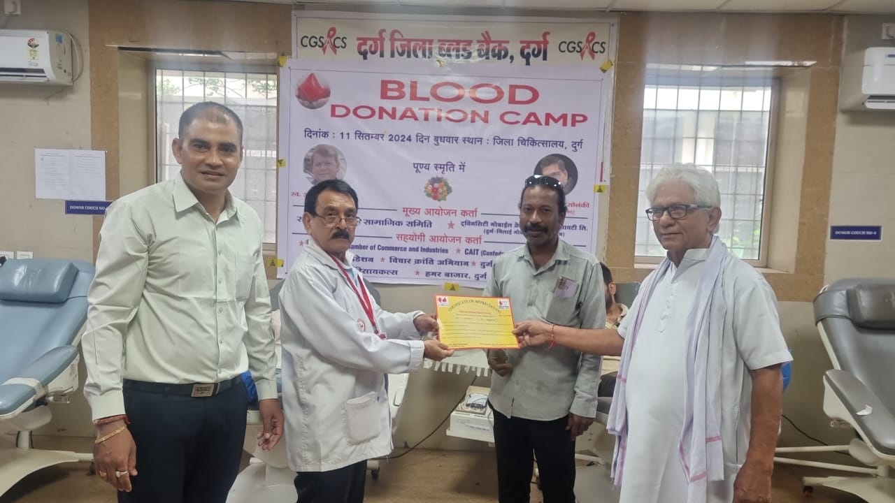 दुर्ग / जिला चिकित्सालय के ब्लड सेंटर में विगत 11 सितम्बर को विशेष रक्तदान शिविर आयोजित किया गया। जिसमें समर्पित परिश्रमी सामाजिक समिति व ट्विनसिटी मोबाईल क्रेेडिट को-ऑपरेटिव सोसाइटी लिमिटेड सुपेला भिलाई एवं अन्य सहयोगी संस्थाए छ.ग. चेम्बर ऑफ कार्मस, नव दृष्टि फांउडेशन, विचारी कांति अभियान, मोबाईल एसोसिएशन, कन्फेडरेशन ऑफ ऑल इंडिया ट्रेडर्स संस्थाओं के रक्तदाता श्री हर्ष खार्पेडे, श्री अमित बड़जात्या, श्री हरीश गावरी, श्री शंकर साहबानी, कु. प्रज्ञा, अधिकवक्ता श्री विनोद देवागंन एवं अन्य रक्तदाताओं ने 91 यूनिट रक्तदान किया। विगत वर्ष 11 सितम्बर 2021 को 40 यूनिट, 11 सितम्बर 2022 को 60 यूनिट, एवं 11 सितम्बर 2023 को 78 यूनिट रक्तदान किया गया था।