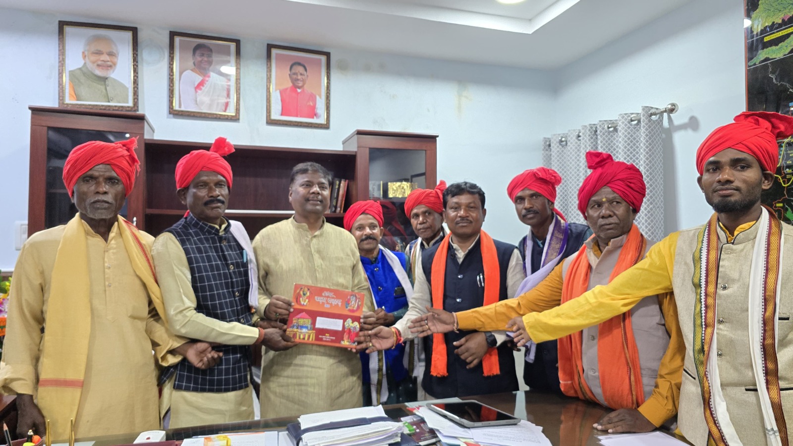 रायपुर, / वन एवं सहकारिता मंत्री श्री केदार कश्यप को उनके निवास कार्यालय में बस्तर के सांसद एवं बस्तर दशहरा समिति के अध्यक्ष श्री महेश कश्यप के साथ प्रतिनिधिमण्डल ने सौजन्य मुलाकात कर बस्तर दशहरा पर्व में शामिल होने के लिए आमंत्रण दिया। मंत्री श्री कश्यप ने सभी आवश्यक तैयारियां की जानकारी ली तथा सफल आयोजन के लिए अपनी शुभकामनाएं भी दी।