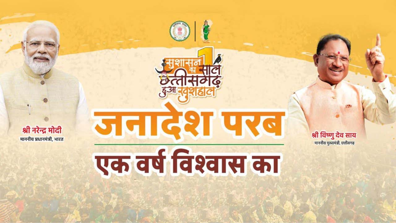 रायपुर / मुख्यमंत्री श्री विष्णु देव साय के नेतृत्व में राज्य सरकार के एक वर्ष पूरा होने पर 13 दिसंबर को छत्तीसगढ़ में जनादेश परब मनाया जाएगा। कार्यक्रम में केंद्रीय स्वास्थ्य एवं परिवार कल्याण, रसायन और उर्वरक मंत्री श्री जे.पी. नड्डा मुख्य अतिथि होंगे। कार्यक्रम की अध्यक्षता मुख्यमंत्री श्री विष्णु देव साय करेंगे। कार्यक्रम राजधानी रायपुर के साइंस कॉलेज ग्राउंड में दोपहर एक बजे से होगा जिसमें राज्य सरकार के सुशासन के एक साल की झलक दिखाई देगी।